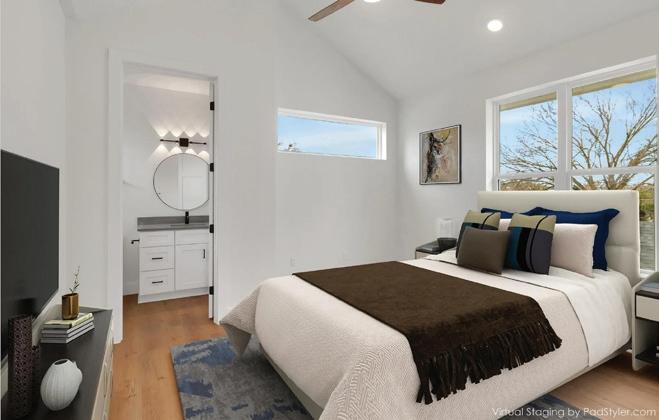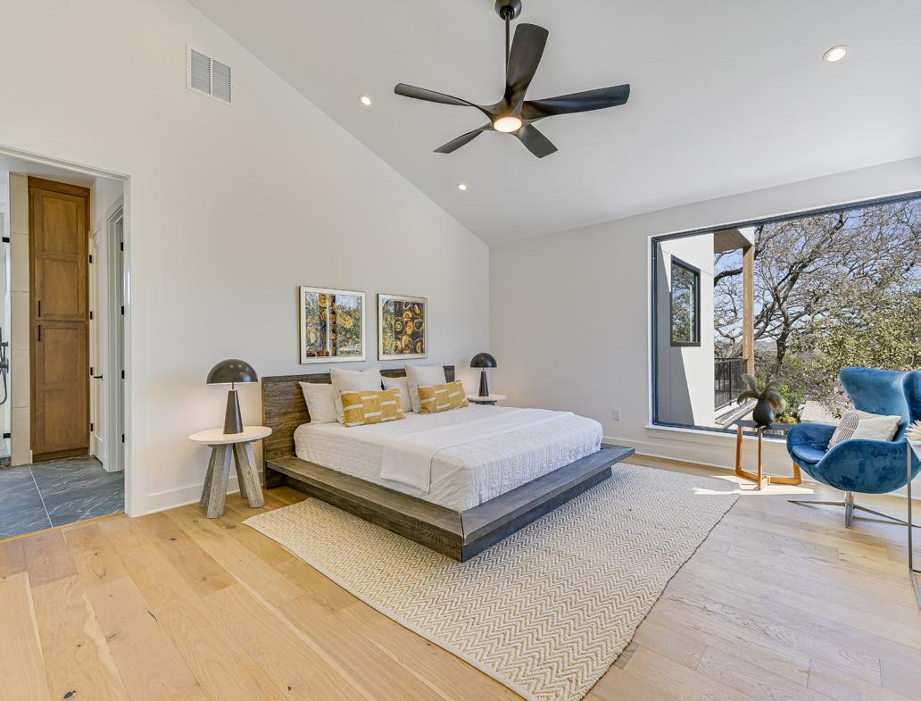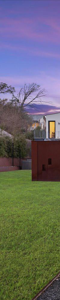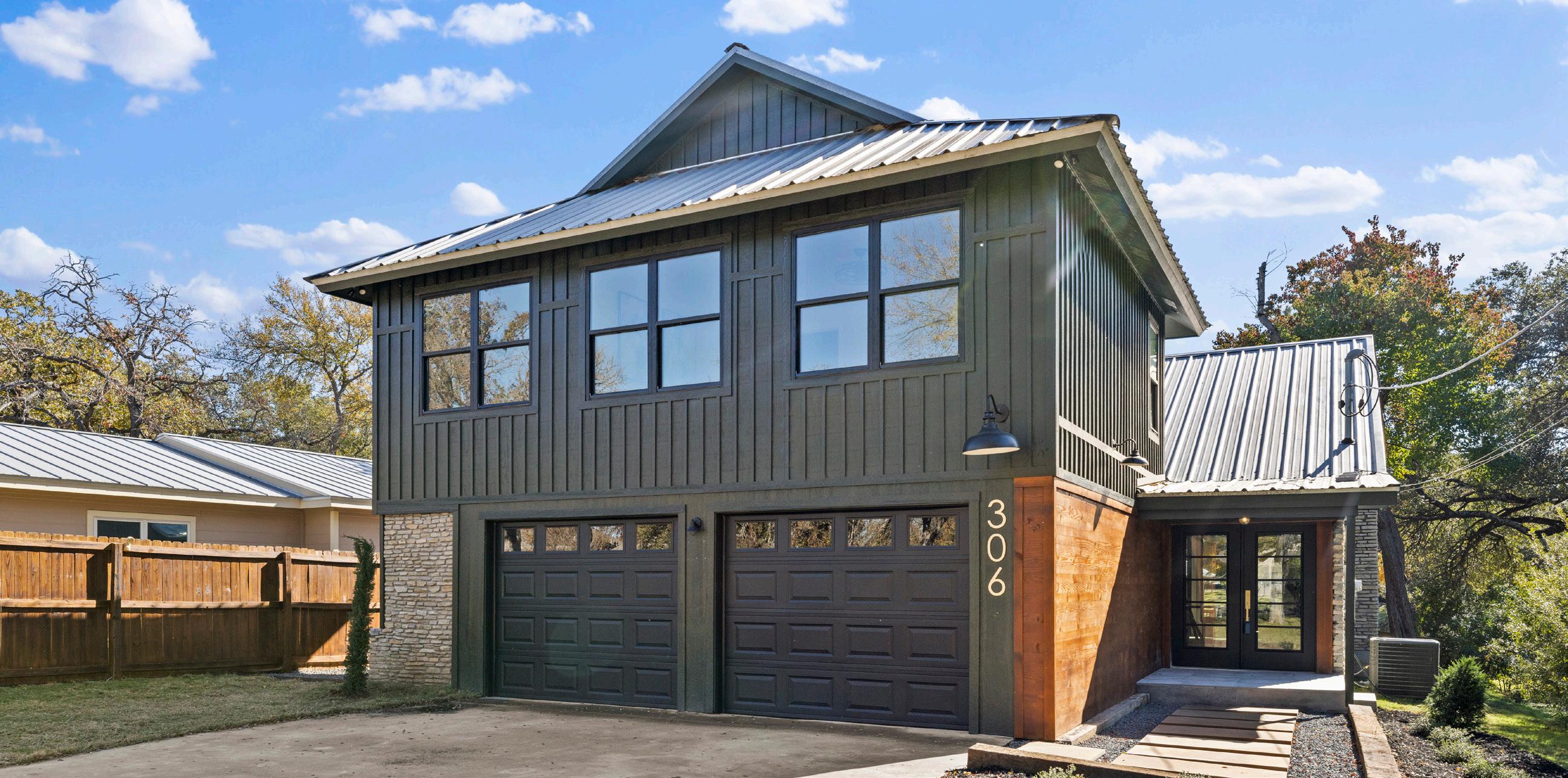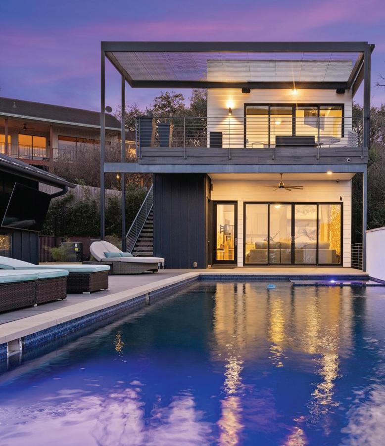 This stunning Bouldin Creek home masterfully blends Austin’s charm with contemporary elegance. Its striking façade features an innovative mix of Dekton stone, warm cedar, and smooth stucco, setting the tone for sophisticated living.