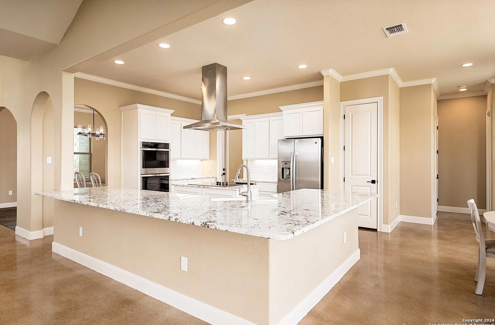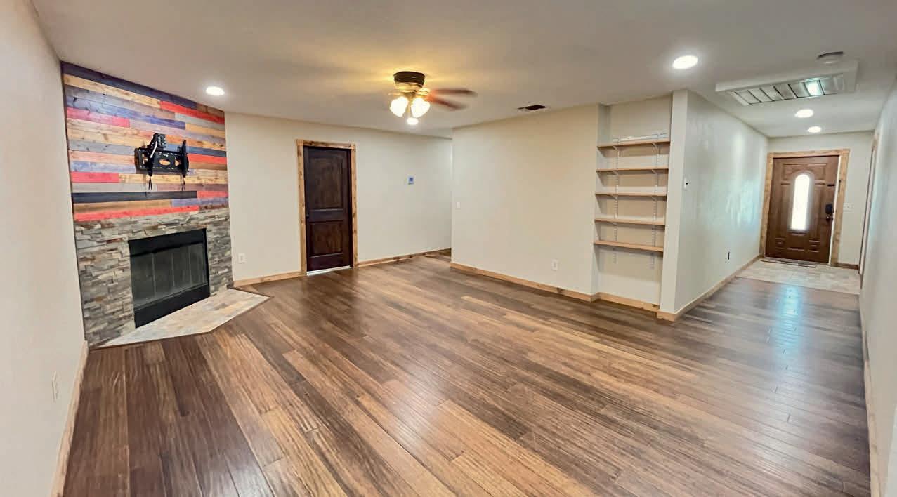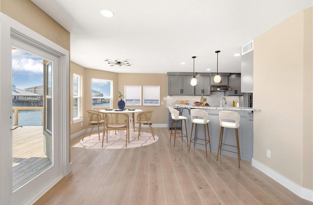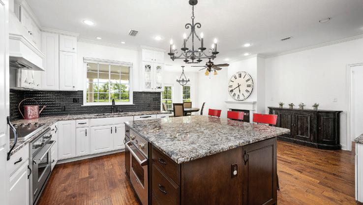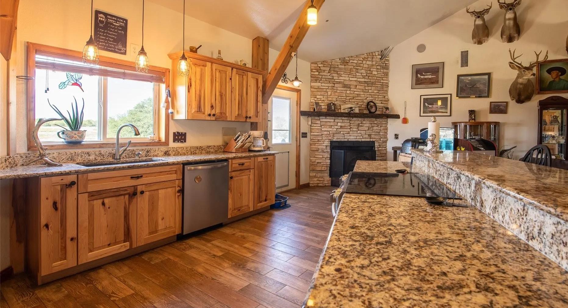 Relax on the full-length porch or patio with your favorite drink while taking in the wildlife. Inside, the open-concept living space features a striking stone fireplace as the centerpiece, seamlessly connecting the kitchen and dining areas. The kitchen boasts sculpted, sealed concrete countertops, a stylish tile backsplash, a bar with seating for four, and a convenient pantry/utility combo. Decorative lighting enhances the home’s inviting charm.