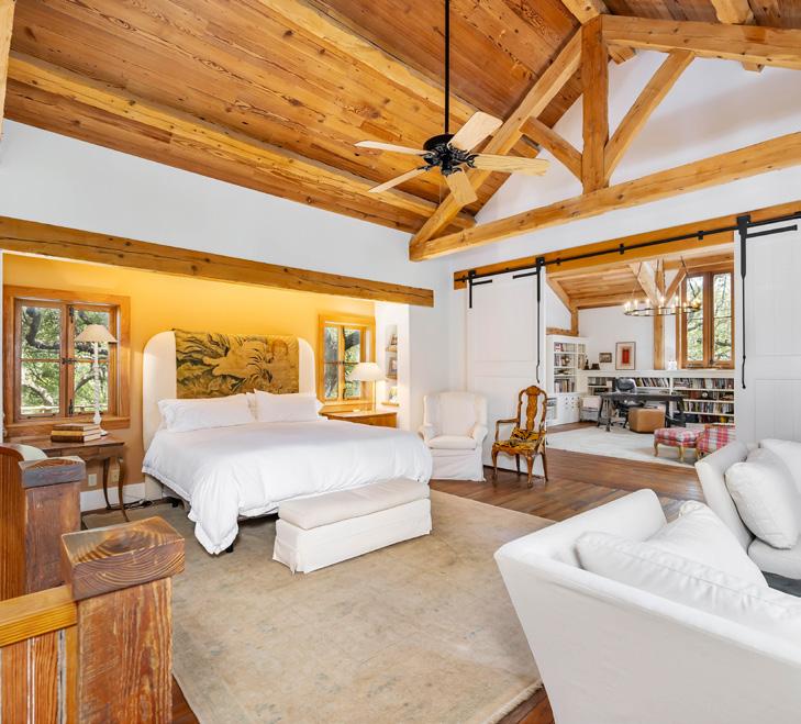 A majestic entrance, flanked by a striking stone wall, ushers you through a lush circular drive surrounding towering cypress trees. To the left, a meticulously appointed guest residence awaits, featuring soaring cathedral wood ceilings, a gourmet kitchen, luxurious bath with heated floors, and a charming courtyard with a tranquil fountain. Beyond lies a professional-grade shop with ample storage and greenhouse with climate control and rain-catch irrigation.