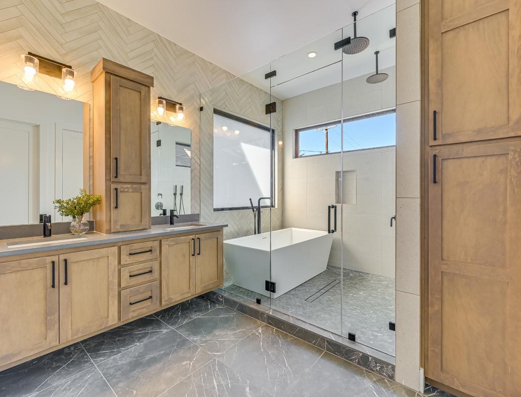 Expansive glass doors open to a covered patio and custom-heated pool, perfect for year-round entertaining. Elegant white oak flooring, in-wall baseboards, and built-ins elevate every space. The primary suite is a serene retreat with a spa-like bath and a freestanding soaking tub.