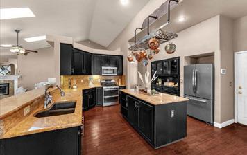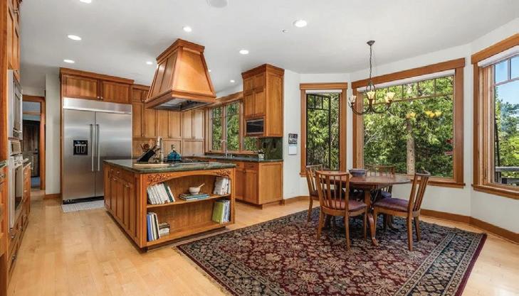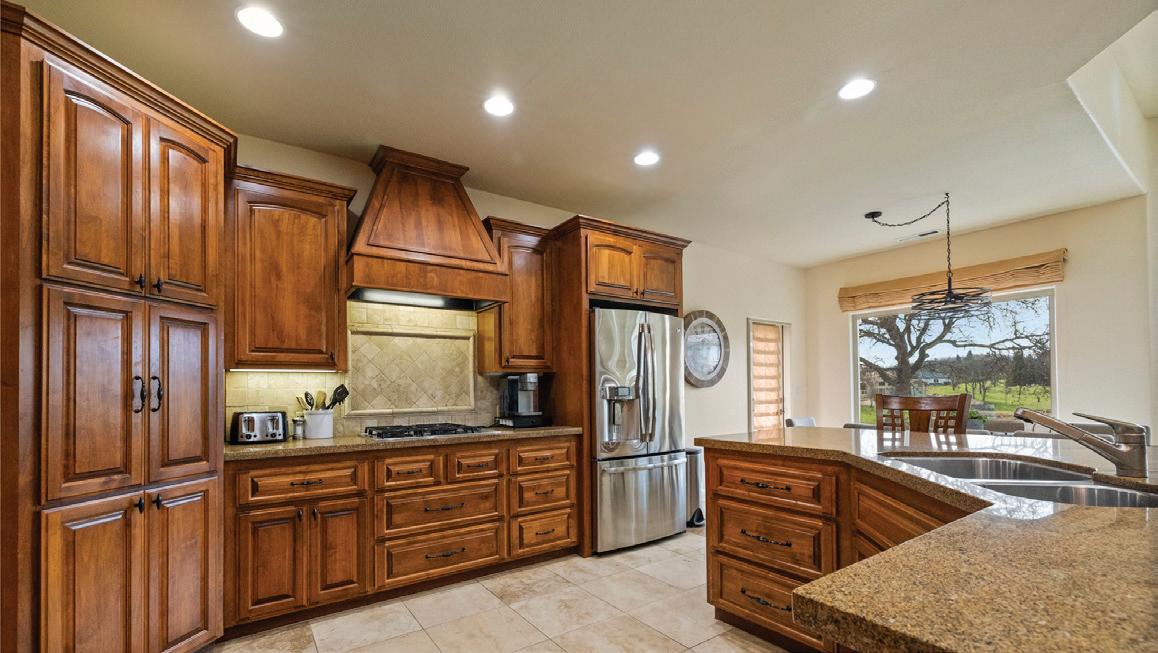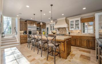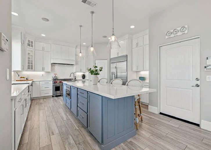 Heart of home features a gourmet kitchen equipped with toptier appliances, including a KitchenAid built-in refrigerator, Sharp microwave drawer oven & Viking Professional gas range with 6-burner griddle configuration. Viking dual side-by-side gas ovens & built-in hood w/warming shelf create a professional cooking environment, while dual GE Monogram wine chillers & ice machine cater to entertaining needs. Silestone countertops & premium Blanco fixtures complete this culinary masterpiece.