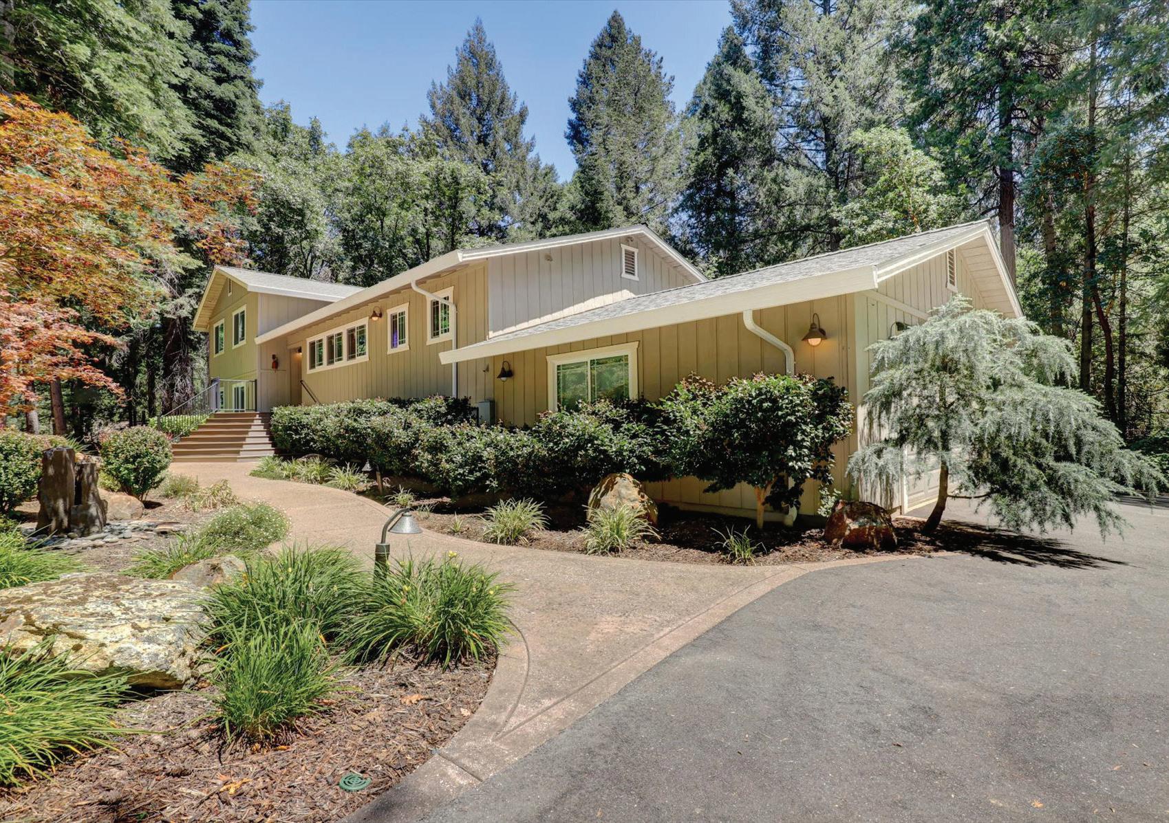 Very cool contemporary home with striking architectural lines on 4.6 private acres in Nevada City! Known as “Quail Ridge,” the home welcomes you with a tiled two-story entry, step-down living room with floor-to-ceiling windows and vaulted open-beam ceilings. The spacious kitchen boasts updated appliances, pantry, and ample counters. Main-level primary suite plus a dramatic loft with skylight, built-in desk, and guest rooms. Features include a library wall, generator, garage with breezeway, and beautiful natural landscaping!