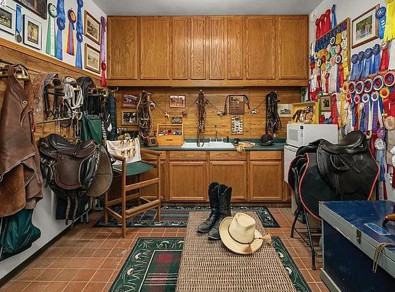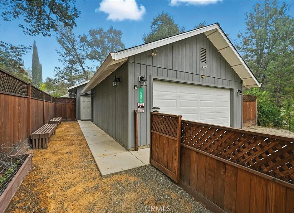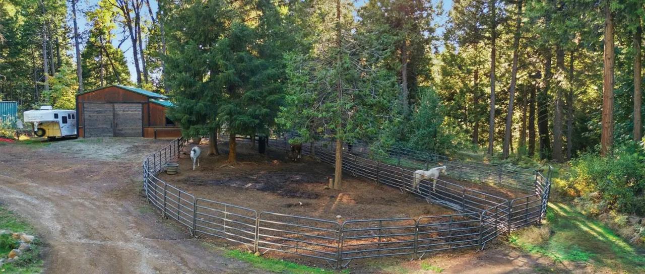 Fenced and crossed fenced. Coarsegold, partial A frame, Advanced Home, western theme. Beautiful custom kitchen with copper sink, Shiplap master bedroom. Custom concrete kitchen counters. There is a loft would be a great kids play area. Newer wood stove Separate hay barn, separate 3 stall barn with pass thru doors, nice size arena, horse wash station, tack room. 2 large open stalls. Mature fruit trees, chicken coop, cat house, and some lovely landscaping all on a corner lot. Plenty of room for RV Seller still in process of moving items out of barn and some minor repairs.