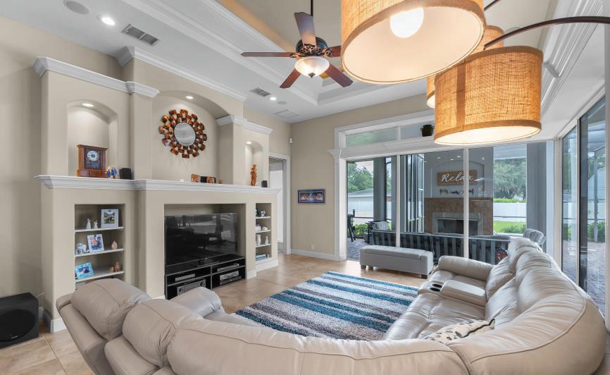 The pool vacuum was replaced in 2025. A UV light has been added to the AC system to protect against mold and mildew. This home features dual-pane windows and a spacious living room and dining room. The eat-in kitchen is well-appointed and features abundant cabinetry, solid surface countertops, a breakfast bar, and a breakfast table area with a swimming pool view. You will appreciate the enormous sunny family room with a fireplace and pool access. There are two oversized bedrooms and a hall bathroom right off the family room. The large owners suite is on the opposite side of the house and has access to the pool and lanai. It features a large bathroom with a garden tub, separate shower, double sinks, hard surface counter tops, and a huge walk-in closet. You cant beat the location. Ample shopping, restaurants, and entertainment are just minutes away. Easy access to Downtown Tampa, Tampa International Airport, Wiregrass and Grove Malls, I-75, I-4, and the Suncoast Parkway.