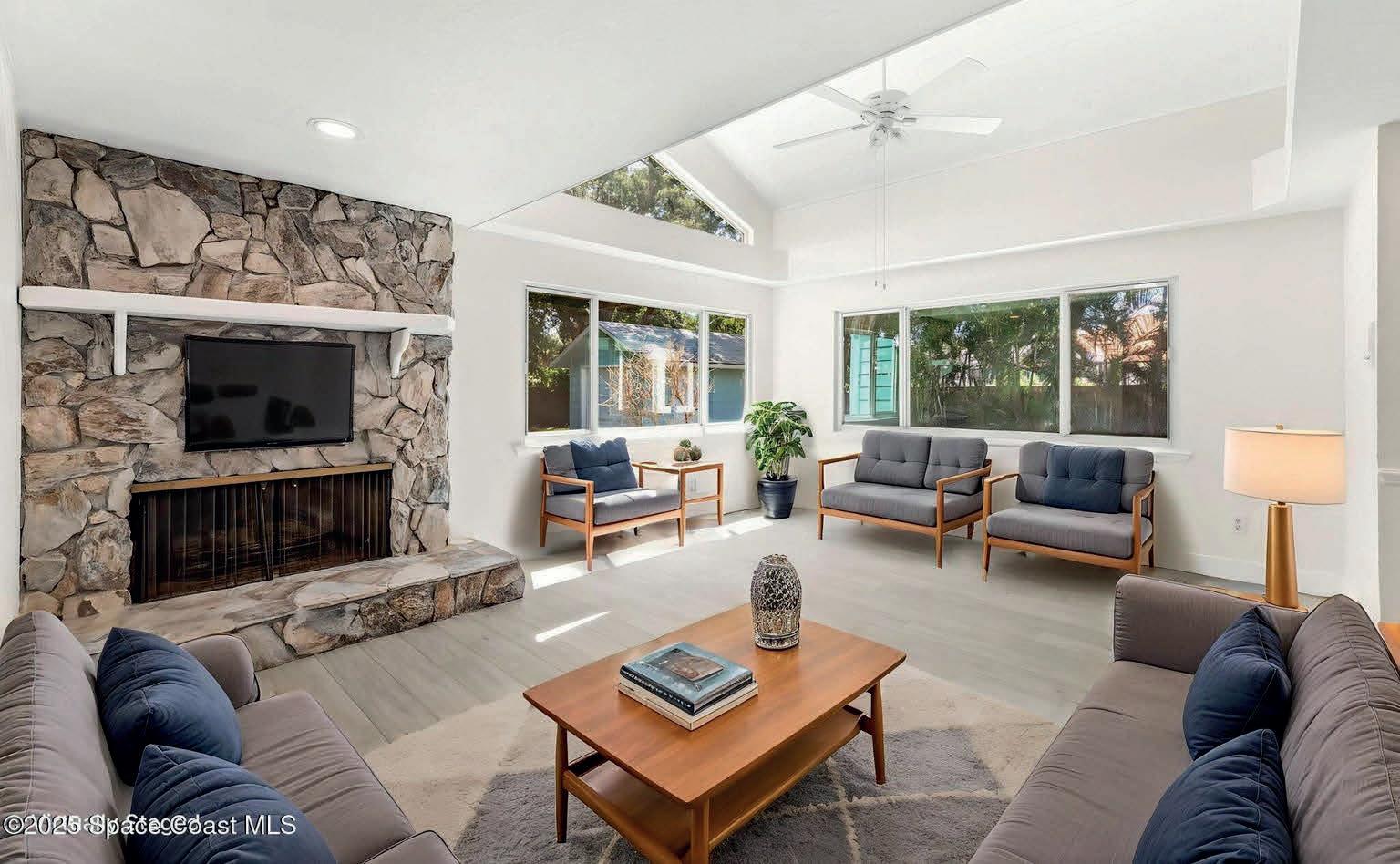 This fully renovated Merritt Island home offers nearly 2,900 sq ft of stylish, reimagined living with soaring ceilings, impact windows, and abundant natural light. Features include a gas fireplace, versatile flex space, and a modern kitchen with Cambria Quartz counters and stainless-steel appliances. The primary suite boasts its own fireplace, private deck, and a glass-enclosed retreat in the trees. Outside, a tropical backyard with a pavilion, shed, and room for a pool creates a perfect outdoor oasis. Freshly updated with new paint, trim, fans, and lighting, every detail reflects thoughtfulness and originality.