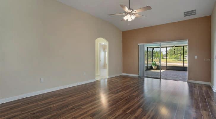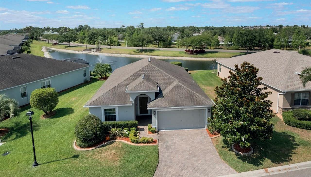 This Custom expanded Gardenia Model has picturesque views through the floor to ceiling glassed-in lania that looks out to the Truman Executive Golf Course and water front pond. A New roof was added in 2024, New garage door in Jan 2025, New HVAC in 2023, New mechanicals in Oct 2024, New flooring throughout in 2022 & New quartz counter tops in the kitchen and both baths. The Masterful primary bedroom flooring was upgraded in 2023. An outdoor covered patio was added in 2017 that looks out to the plushness of the golf course and pond frontage. The kitchen has roll out shelving, a new double sink, new polished faucet plus all the cabinetry was freshened in 2017. The breakfast nook is perfect for a quick meal. This home has 200 amp service and an extra 30 service was added for exterior lighting. “Step rails” were added at the breakfast bar. This open floor plan has ‘slide away’ glass doors to the lanai. The laundry room is home to the 3 year old washer and dryer set. At just under 2000 heated square foot, (not including the lanai), this block and stucco home is ready for it’s new owner. The spacious 2 car garage has a workbench & plenty of extra storage. Walk to Duval pool and mail station. This home is a skip away from medical facilities. High ceilings, split bedroom arrangement, awesome kitchen, open dining area, twin sinks and double closets in the masterful main bedroom is only one reason you’ll want to call it your own paradise! Low low low bond balance.