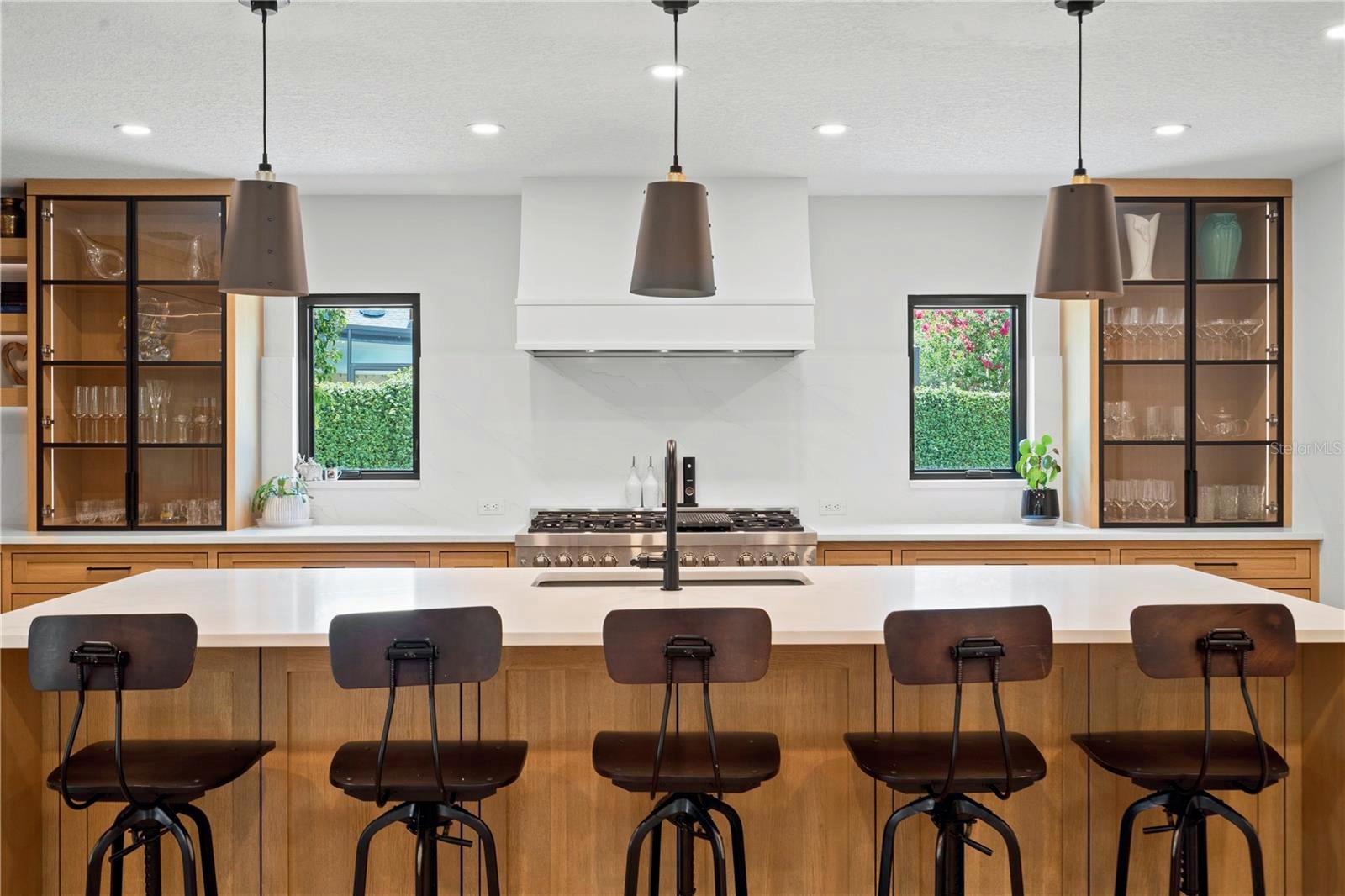 The sleek kitchen showcases quartz countertops, Bosch stainless steel appliances, a gas range, prep sink island, and breakfast bar.