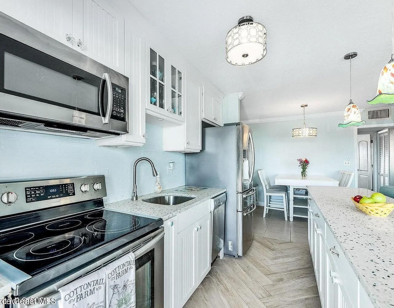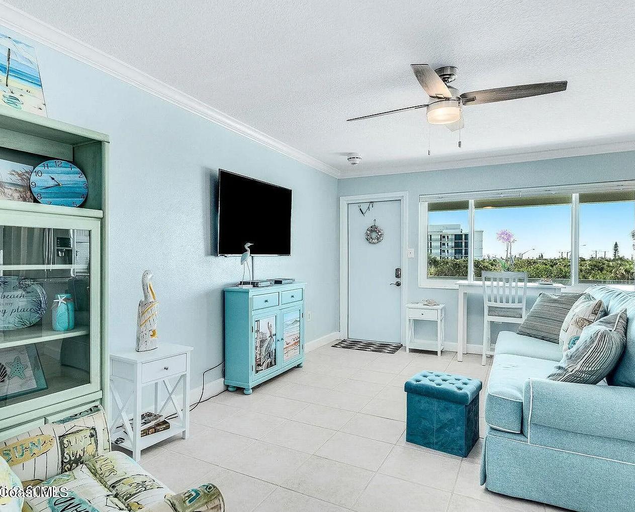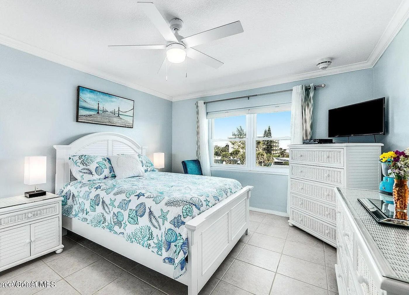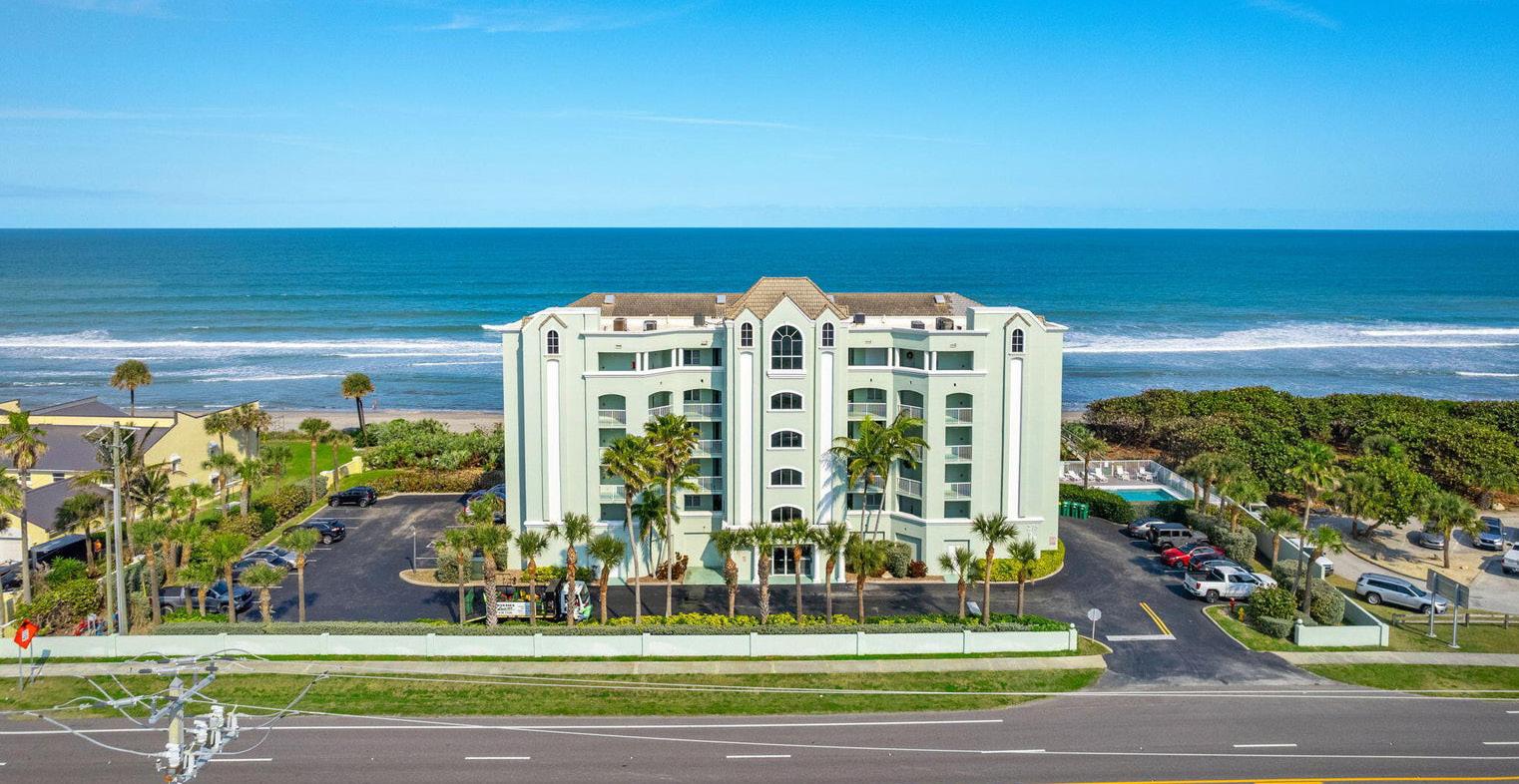 Wake up to the sound of waves and breathtaking ocean views from this 4th level condo, fully remodeled in 2021. Enjoy sunrises and rocket launches from your private balcony while relishing the convenience of direct beach access via a boardwalk-style ramp. The property also features a solar-heated pool, a tiki hut for barbecues, and a welcoming common area. Inside, the condo exudes modern elegance with a chef-style kitchen, granite countertops, and a spacious island. Ceramic tile floors, tiled showers, dual sinks in the master bath, and wireless blinds on sliding doors add to the luxurious feel. Appliances, including a tankless water heater, washer, dryer, and microwave, are all included, making this home move-in ready. With the S.I.R.S. assessment completed and covered in the 2025 budget, this is your chance to enjoy a worry-free, beachfront lifestyle. Contact us today to make this coastal retreat yours!