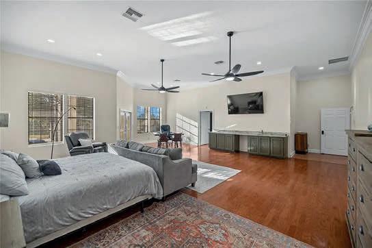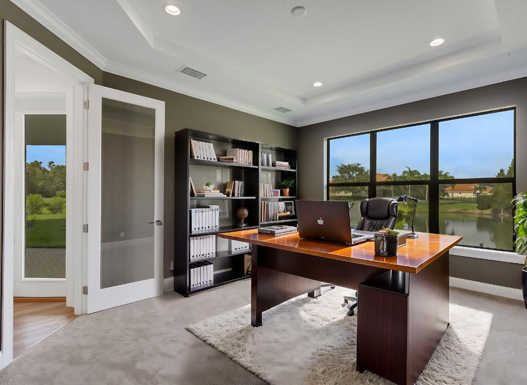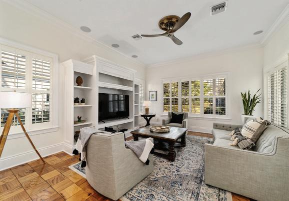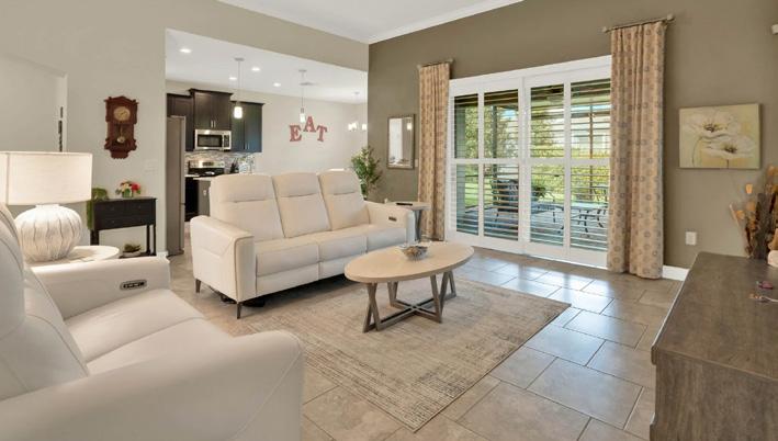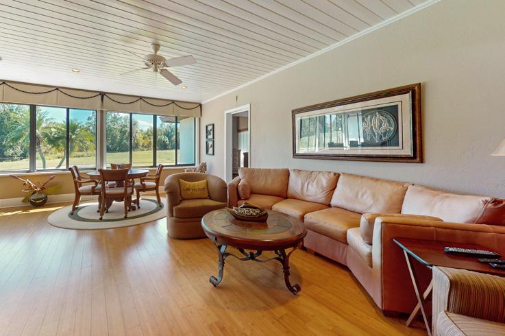 The family room flows effortlessly into the bright and airy Florida room, with panoramic lake views as the backdrop. The main-level guest suite offers comfort and convenience with retractable shades, an en-suite bath and direct access to the expansive Florida room. The split floor plan ensures privacy, with the primary suite tucked away to include a spacious sitting area, inlaid crown molding with accent lighting and a massive walk-in closet that’s more like a room of its own, complete with a separate storage area.