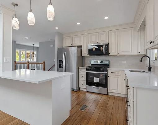 BRAND NEW! High end materials, quality construction and 2025 decor. Top floor boasts an open floor plan with soft close cabinets, quartz countertops, stainless steel sink and appliances. Gorgeous bamboo flooring. Two skylights. Two bedrooms upstairs including a primary that has a wall of patio doors that open to a balcony. Gorgeous windows and window treatments. Lower level has a generous sized family room with luxury vinyl plank floors and two bedrooms and another brand new bathroom. Enclosed porch. Beautiful fenced yard and a dog run. Walk to shopping, movies, restaurants, library, Pavilion fitness center, schools, parks and Rainbow Falls. Come see for yourself!!!