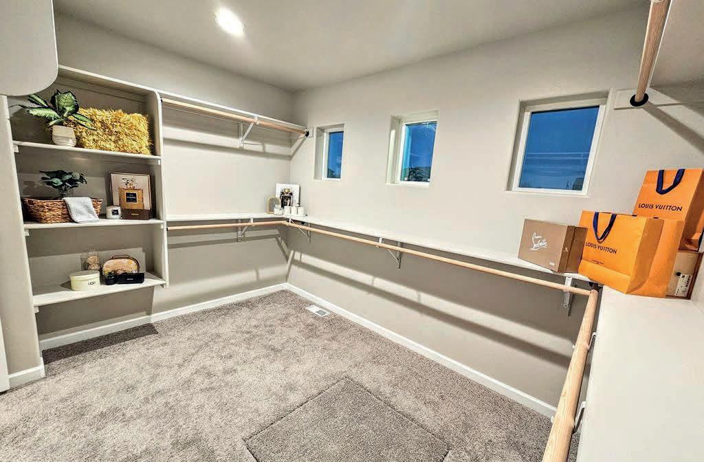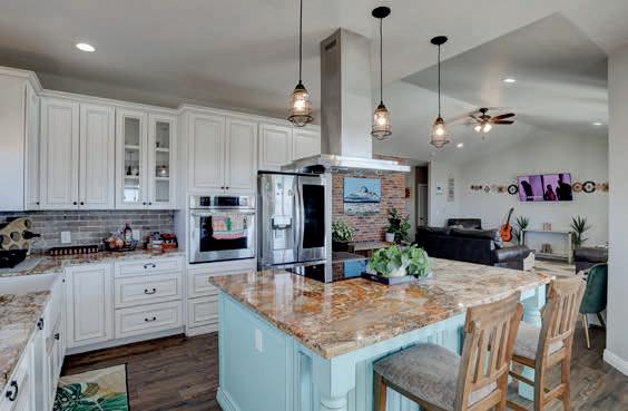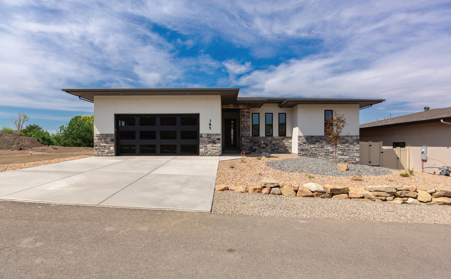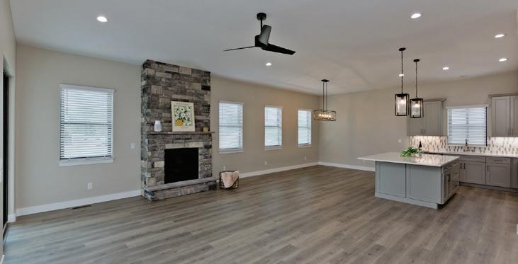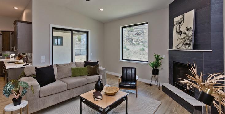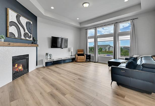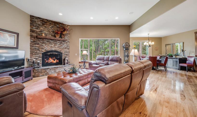 This beautifully designed 4-bedroom residence combines timeless architecture with luxurious finishes, creating a home built to last. A colored concrete walkway leads to the welcoming covered front porch, the perfect setting to relax and take in the mountain views. At the heart of the home, a dramatic floorto-ceiling dual-sided stone fireplace separates the living room from the expansive kitchen and dining areas. A matching stone accent wall enhances the dining room, while the gourmet kitchen is equipped with a Thermador 5-burner range and hood, a Thermador self-cleaning convection oven, and a warming drawer. The tall eating bar is an ideal spot for casual snacks before stepping out to the covered deck, thoughtfully designed for entertaining. The primary suite offers spa-like amenities, including dual glass vessel sinks, backlit custom mirrors, and a spacious walk-in closet. A convenient office—or cozy TV room— rounds out the main level, making the home as practical as it is elegant. The main floor laundry, located adjacent to the garages, is outfitted with a laundry sink, custom cabinetry, and a private closet—providing both functionality and style.