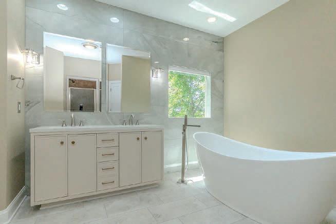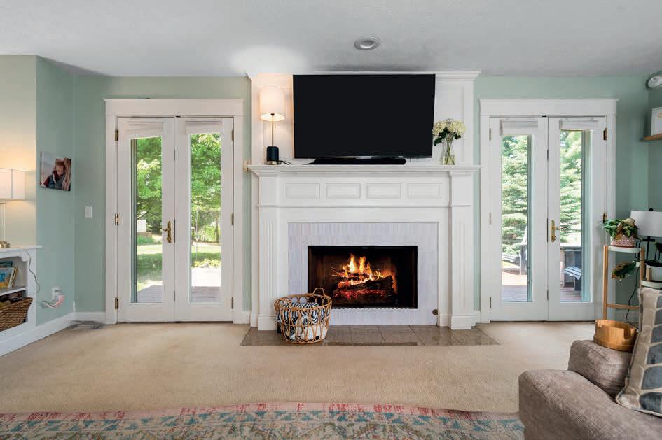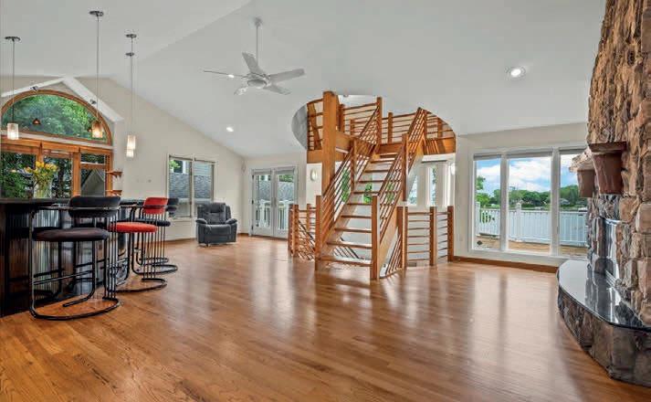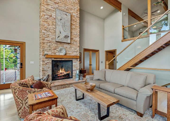 From the moment you step inside, you’re greeted by sculptural staircases, including a dramatic floating staircase, grand stone fireplaces, and rich natural finishes. Walls of windows bathe the home in sunlight while framing breathtaking lake and wooded views. The custom gourmet kitchen, outfitted with professionalgrade stainless steel appliances, is ideal for hosting large gatherings and entertaining in style.