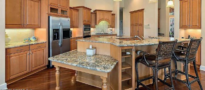 At the heart of the home, the gourmet kitchen impresses with a massive quartzite island, Thermador appliance suite, double oven, and a walk-in pantry, all seamlessly open to the expansive living space. From here, oversized pocketing sliders disappear to reveal a screenedin lanai with an oversized pool, three tranquil waterfalls, a spa, and a limestone deck—the perfect space to entertain or unwind in private.