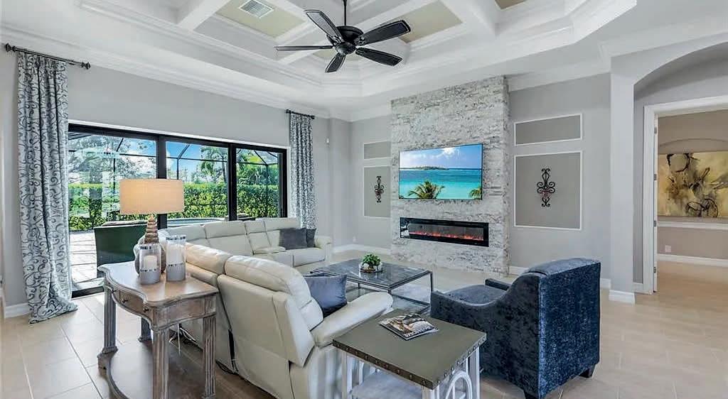 Outside, the grounds unfold like a private resort. A white sand beach stretches across 110 feet of waterfront, while the 1,400-square-foot covered lanai offers shade and style. The saltwater pool and spa, complete with a sun shelf and flickering fire features, are enveloped by lush, tropical landscaping designed for both visual impact and privacy. For those who relish the boating lifestyle, Gulf Harbour’s deep-water marina offers effortless access to destinations like Sarasota, Naples, and Marco Island. And for golfers, the championship-caliber course, meticulously maintained and rich with Florida charm, offers immediate membership opportunities.