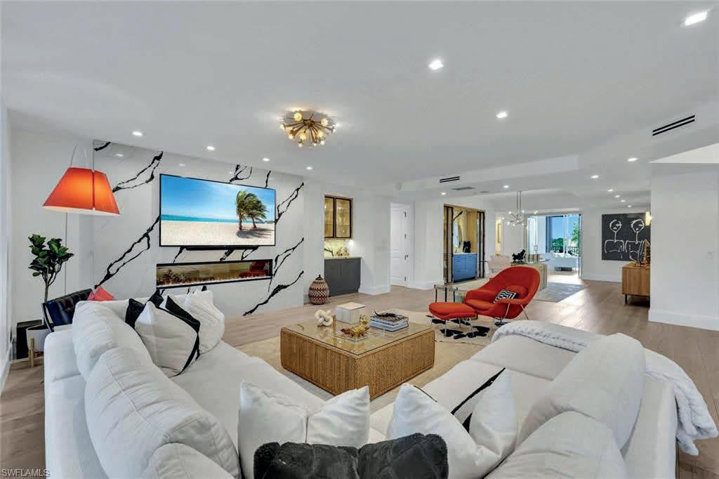 This beautifully designed open floor plan offers incredible flexibility for everyday living. Every detail has been carefully considered, evident in the custom drapery, plantation shutters, detailed millwork, and the expansive terraces that welcome both sunrise and sunset views. The kitchen shines as a warm and inviting space, featuring expansive countertops, sleek white cabinets, and a charming breakfast nook. The home includes two spacious guest suites, each complete with its own en-suite bathroom and walk-in closet. The owner’s suite serves as a serene getaway, opening onto a screened lanai that frames stunning views of the gulf. As an end unit, this home provides 180-degree panoramic views of the gulf, park, and bay. Just minutes away, you’ll discover the cultural delights of Venetian Village, Waterside, Artis, and Olde Naples. Experience the natural beauty of Park Shore, with its parks and green spaces, creating a lifestyle that celebrates coastal living.