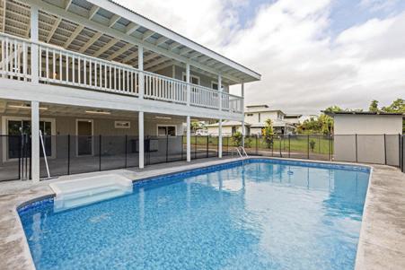 Aloha! You don’t want to miss this stunning 4-bedroom, 2-bathroom home at the top of the Hawaiian Paradise Park subdivision making it an excellent location only 10 minutes from Kea`au or Pahoa town both with desirable amenities! The home is two story. The primary suite equipped with its own ac unit, full en suite bathroom, walk-in closet, cathedral ceilings, and a covered lanai comprise the entire second story of the home. The first floor of the home offers a breathtaking kitchen fully equipped with all appliances and downstairs ac unit. Brand new quartz countertops with full backsplash offer ample space to prepare meals, and a custom 45-degree pantry offers a substantial amount of space to store all your dry goods. This exceptional kitchen not only boasts a full island with an undermount sink and dishwasher, but it also has an exceptional custom breakfast bar that really ties your living space together. It creates a large, welcoming, and open space with grand cathedral ceilings so that your family and friends can stay connected whether they are cooking dinner in the kitchen, playing games, or starting a movie in the living room. Three spacious bedrooms and a full bathroom with a hallway closet for added storage space adjoin your fabulous kitchen, dining, and living room. The laundry room with brand-new front-loading washer and dryer is located to the right of the second story stairwell with garage entrance directly in front. A 4-car covered carport with concrete slab is an enticing feature in the backyard adding a ton of space! The entire acre is fenced with chain link which wraps around the entire perimeter and connects to a grand five-foot rock wall at the entrance of the property with automatic gate for added security and privacy!