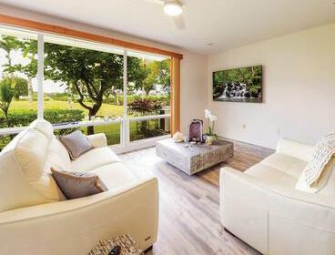 Spacious 1,321 sq ft, 2/2 condo with golf course/mountain & peek-a-boo ocean views, tile throughout, no interior stairs/all one level, adjacent to a park-like grassy space, very private covered lanai, AC, lots of windows for light breezy rooms, furnished excluding staging items. Vacation Rental STVR permitted.