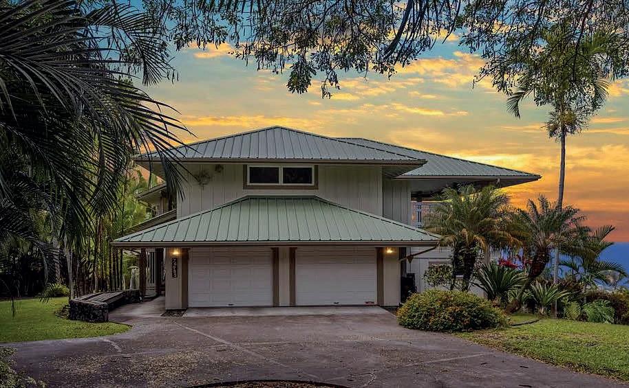 Step into this exquisite home through a covered entryway, where a mature garden welcomes you with exotic flora, including Phoenix pygmy & Manila palms, Australian grass, & lovely ‘Ōhi‘a trees. This one-of-a-kind home blends classic craftsmanship with modern sophistication, nestled in the desirable Up Country subdivision of Kaumana City—just minutes from the heart of Hilo. The expansive living room captivates with vaulted wood ceilings, refinished oak hardwood floors, & custom checkerboard windows that bathe the space in natural light. The main level also features two bedrooms, remodeled bathroom, & a spacious, updated kitchen with solid granite countertops & plenty of cupboard space. The back foyer houses a stylish butler’s pantry with wet bar, gas cooktop & sink—ideal for a private guest suite with the potential for separate living quarters. Bonus room off of the Butler’s Pantry currently is being used as a dining room. The back entryway overlooks a vibrant garden of anthurium & hapu’u ferns. The staircase from the living room leads to the spacious primary suite that offers peace & privacy, a tastefully remodeled full bath, dedicated office space, & views of Hilo Town and the glistening ocean beyond. Wander uphill to the greenhouse—an ideal sanctuary for orchids & vegetables! This residence offers generous parking & storage with an enclosed two-car garage & additional single carport. Highlights include:
