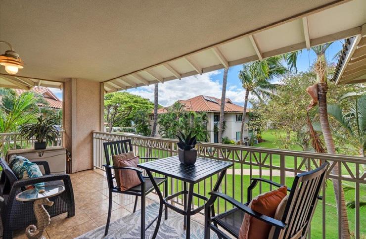 Spacious 1,321 sq ft, 2/2 condo with golf course/mountain & peek-a-boo ocean views, tile throughout, no interior stairs/all one level, adjacent to a park-like grassy space, very private covered lanai with wet bar sink & small refrigerator, Central AC, water filtration system, newer hot water heater, lots of windows for light breezy rooms, furnished excluding staging items. Unique feature—this unit has a large, lockable storage area to store your personal items if you rent it out part of the time. One covered parking space with additional storage. Easy walk to the oceanfront pool & two other pools & tennis/pickleball courts. Vacation Rental STVR permitted.