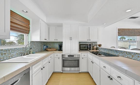 Enjoy spectacular 270-degree views of the beach, bay and seaport in this one-of-a-kind 3-bedroom, 3.5-bath, 2-story penthouse with large private roof deck and 2 additional balconies, all with spectacular sunsets. All ceilings are 10 - 11 feet high to create a very spacious feel. All bedrooms have stunning water views, ceiling fans and en suite bathrooms. The primary bedroom has a private balcony, remodeled en-suite bath with custom cabinets, granite countertops and under-cabinet lighting. There is an enormous walk-in closet with built in cabinetry and ample storage space. The open concept living room has access to the roof deck and an additional balcony facing the beach. The kitchen has all stainless steel Thermador appliances, custom built white cabinets with loads of pull outs and upgrades, granite countertops and custom lighting. This unit comes with a private 2-car garage and a climate-controlled storage unit.
