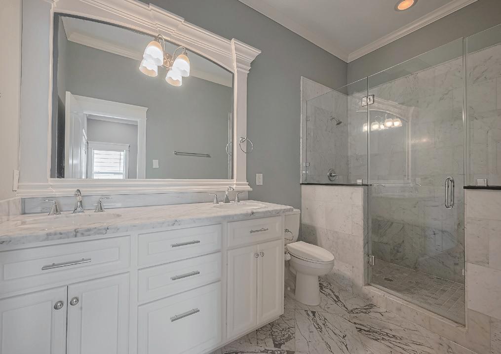 The chef’s kitchen is both stunning and functional, featuring sleek stainless steel appliances, gleaming quartz countertops, an oversized island, and generous custom cabinetry—ideal for entertaining or quiet evenings at home. The expansive primary suite serves as a private retreat, complete with a spa-inspired bath featuring a double vanity, walk-in shower, and dual closets.
