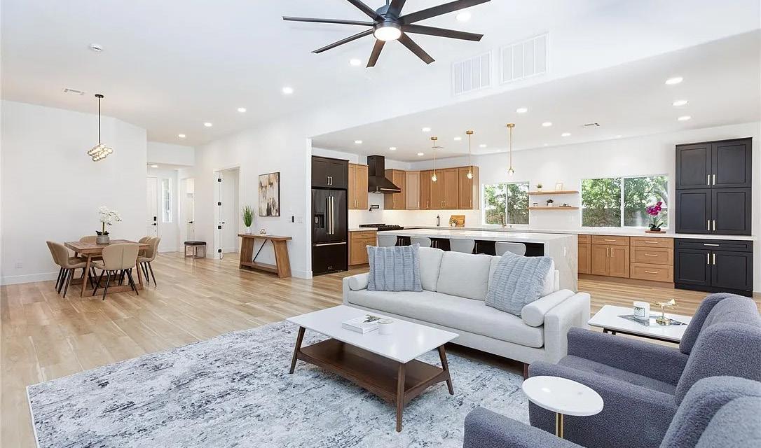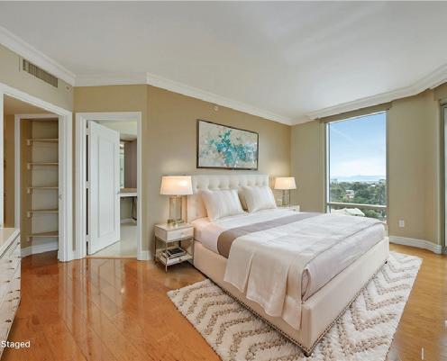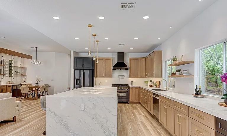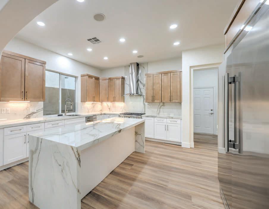 that create a truly serene backdrop for everyday life. The expansive open floor plan, soaring ceilings, and designer finishes throughout. The gourmet kitchen, featuring all new top-of-theline appliances, new custom cabinetry, a large center island, and elegant quartz countertops The spacious primary suite is a true retreat,