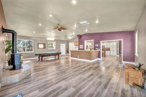 This is a beautifully designed family home, perfect for both everyday living and entertaining. With 3,451 square feet of space, this expansive ranch-style house features vaulted ceilings and a great room with a fireplace and bar, creating a welcoming atmosphere for guests and family gatherings. The thoughtful split floor plan ensures privacy for all family members. The chef’s kitchen is a standout with its large center island, corner pantry, brand-new cabinets, granite countertops, farmhouse sink, and new appliances, ideal for preparing meals and hosting. Natural light fills every corner of the home, making the living areas feel bright and airy. The spacious primary suite includes a luxurious bathroom with a corner spa tub and a walk-in shower, offering a tranquil retreat. Outside, the property is equally impressive with solar, side parking for an RV or boat, as well as a large PebbleTech propane-heated pool and spa that can be enjoyed year-round. The expansive patio runs along the side of the house, perfect for outdoor entertaining. The home is situated in a nice neighborhood near a golf course, surrounded by similar properties, and boasts rear lake and mountain views.