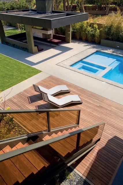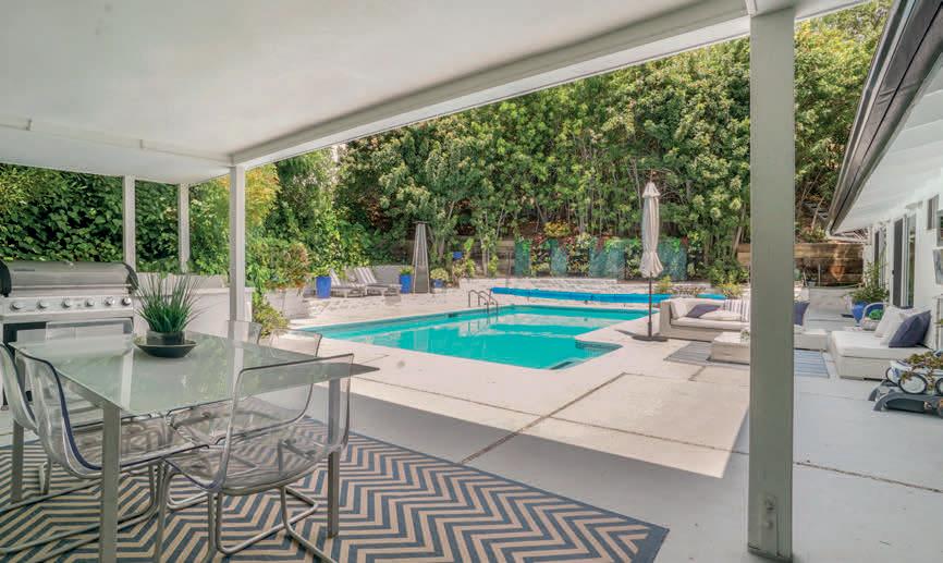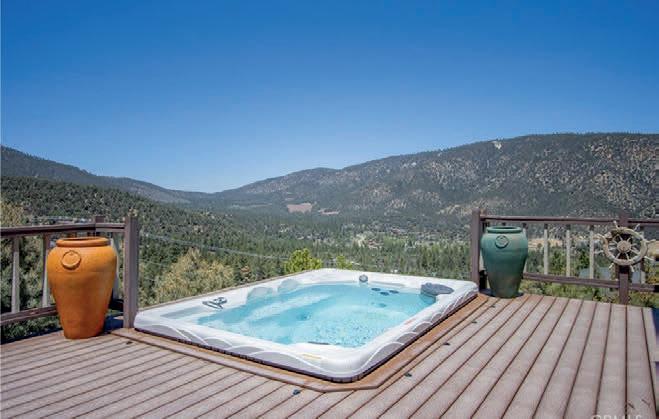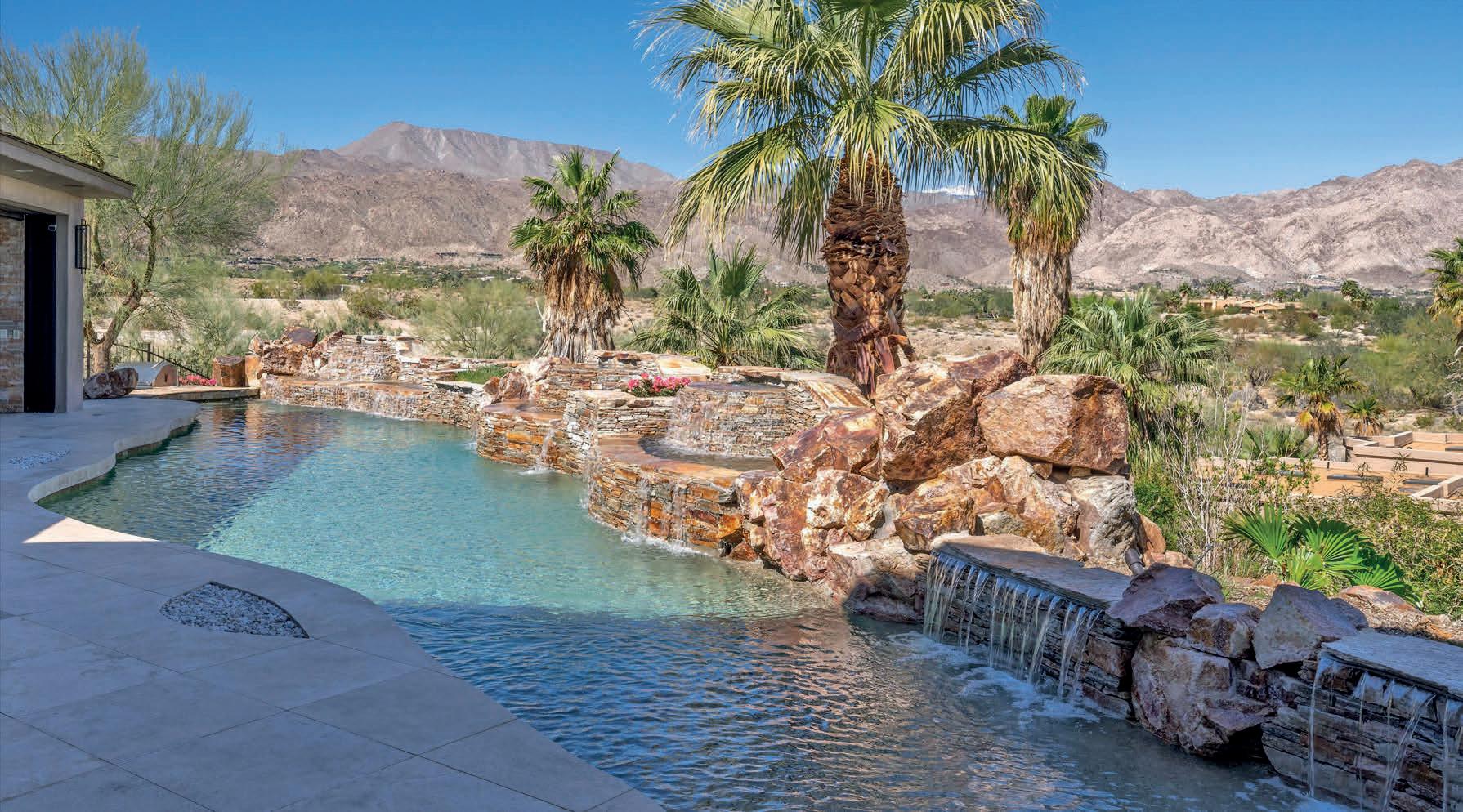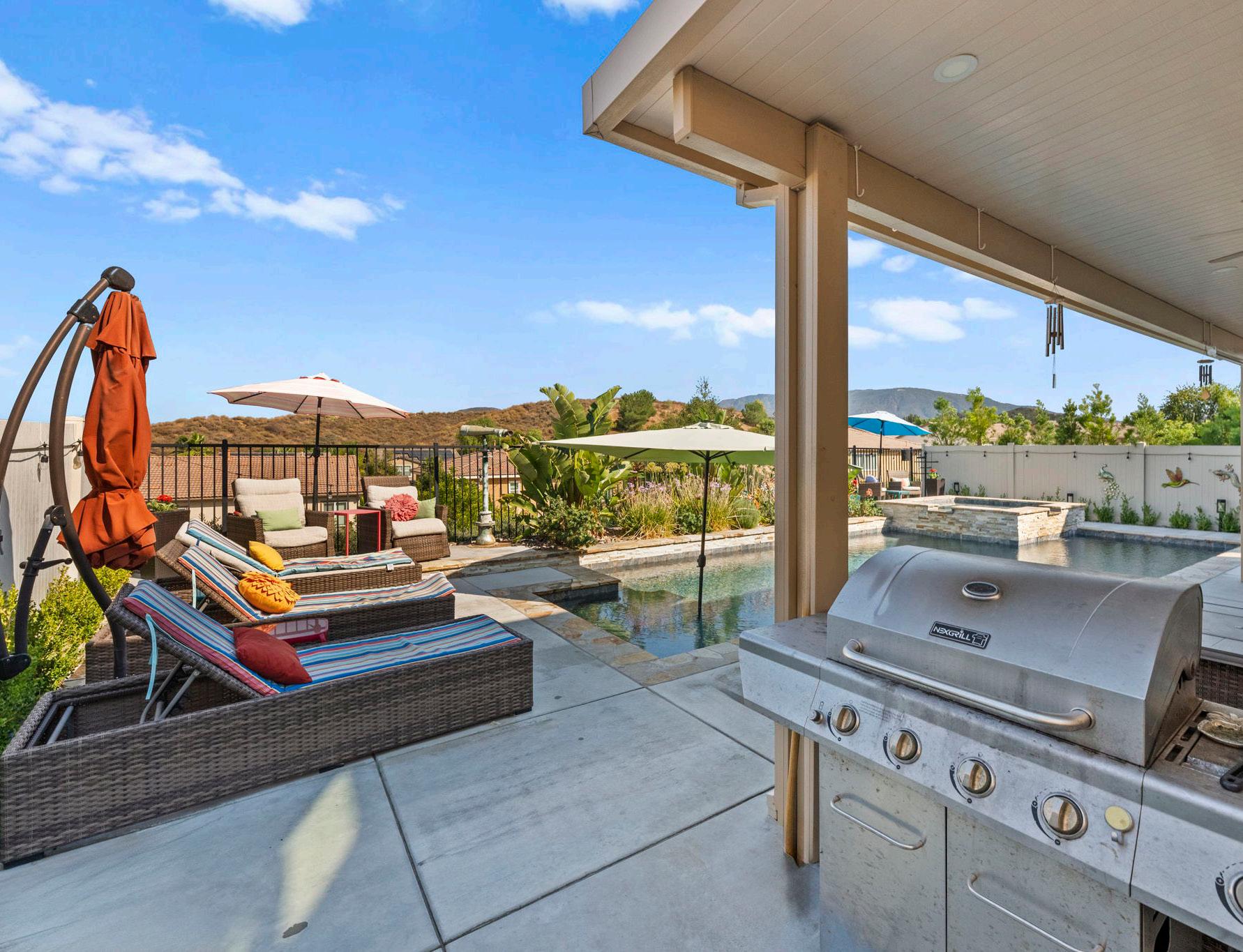 ■ Backyard area features a pool and spa, covered patio, and outdoor kitchen with stunning views