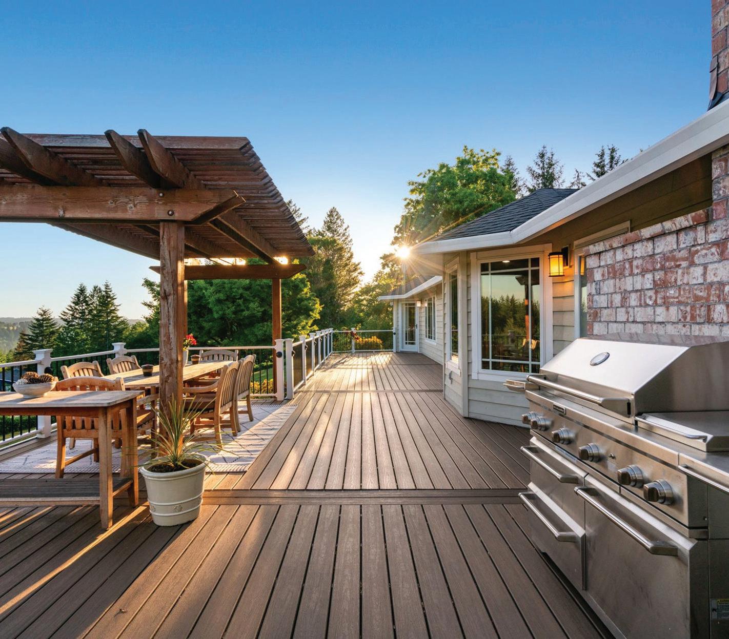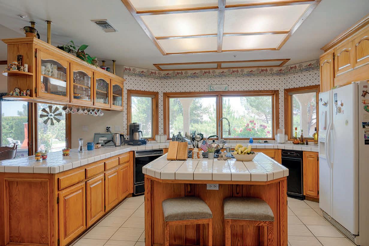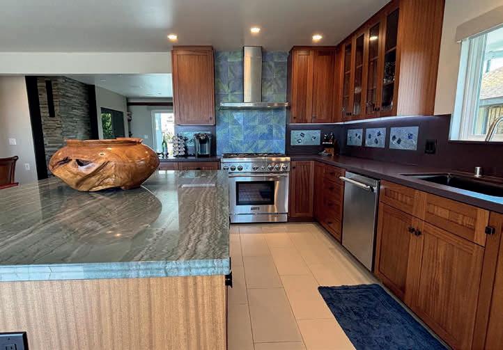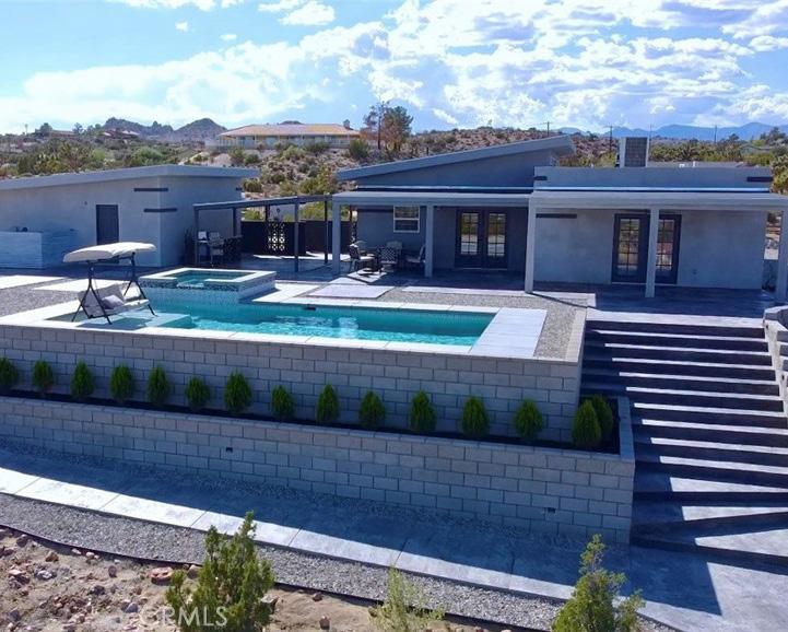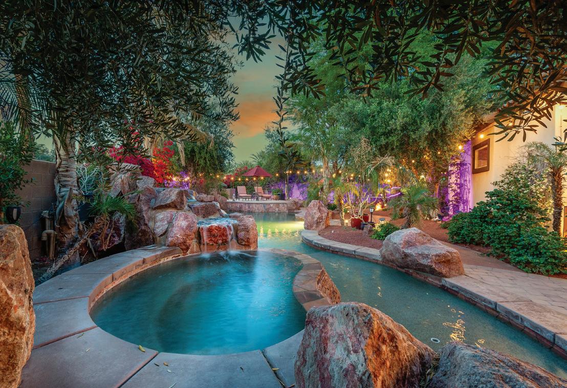 ■ Backyard area features a pool and spa, covered patio, and outdoor kitchen with stunning views