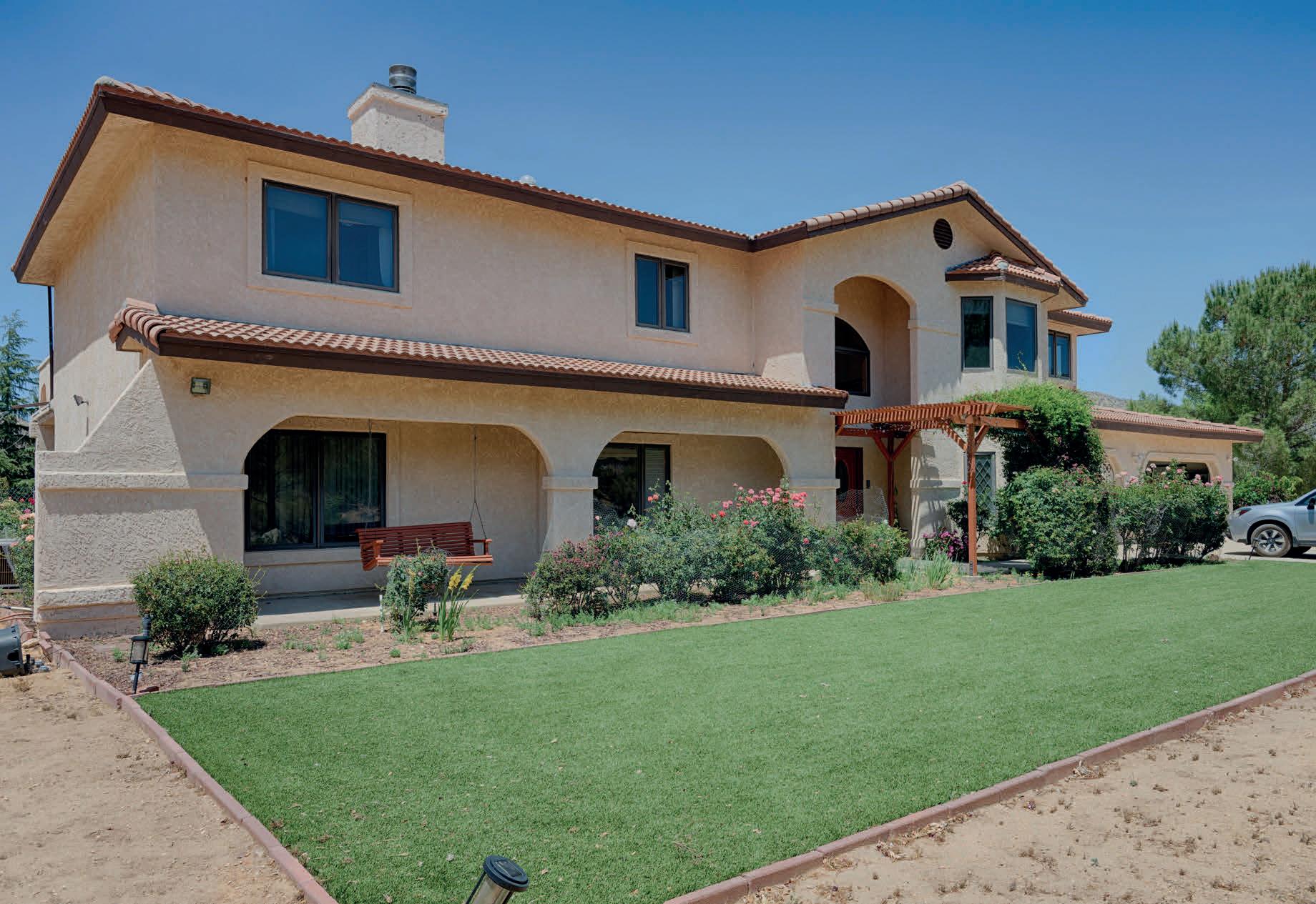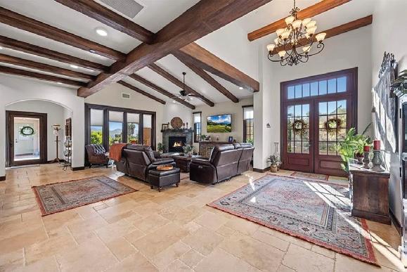 Located in the gated enclave of Virazon on a quiet cul-de-sac, this charming single-story home is set up from the street on a corner lot. Flagstone steps lead up to the front entry, with a charming front patio. Flanked by landscaped planters and carriage lights that top the stone pilasters, this home is finished with clapboard and shutters. The backyard is finished with a beautiful pool/spa, BBQ center, grassy areas, and patios. Step through the arched iron and glass entry door to a private courtyard with a cornered outdoor fireplace and planters. The courtyard leads to the front door where the foyer is open to the formal dining room, along with the hallway leading to a secondary bedroom wing. The center hall provides access to the primary bedroom suite on one side, and the living room, family room kitchen and an additional bedroom suite on the other. The flooring throughout is marble tile or engineered wood. There are four bedrooms plus an office. The yard is a private oasis, with mature landscaping and multiple patios and grassy areas. The BBQ center is adjacent to the patio just off the family room and breakfast area. The pool is finished with a flagstone coping, stacked stone waterfall from the raised bond beam spa. This gated enclave is part of a larger master planned community, Dos Vientos Ranch. This area is surrounded by State and National parks with majestic mountains and rugged foothills that add to the breathtaking views. Nearby hiking trails are within the community and available in the nearby parks, along with equestrian facilities.
