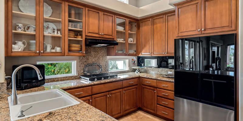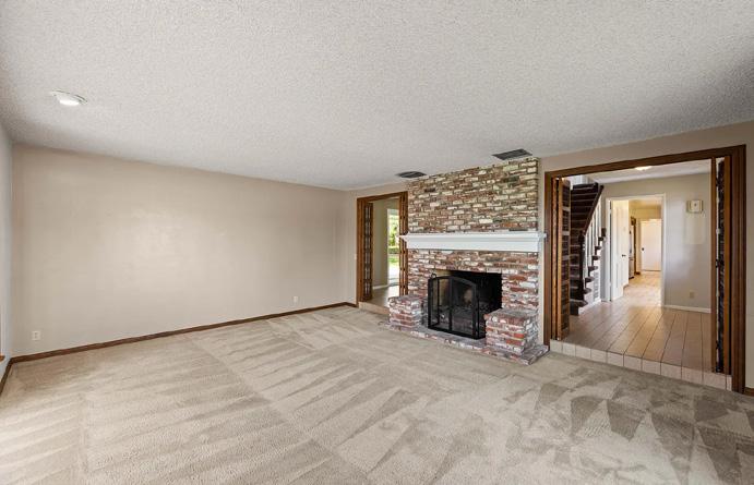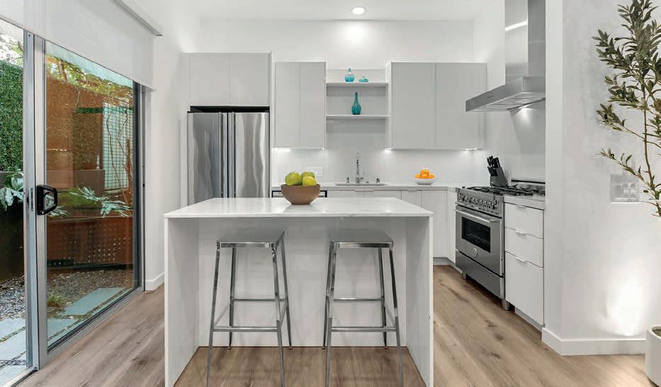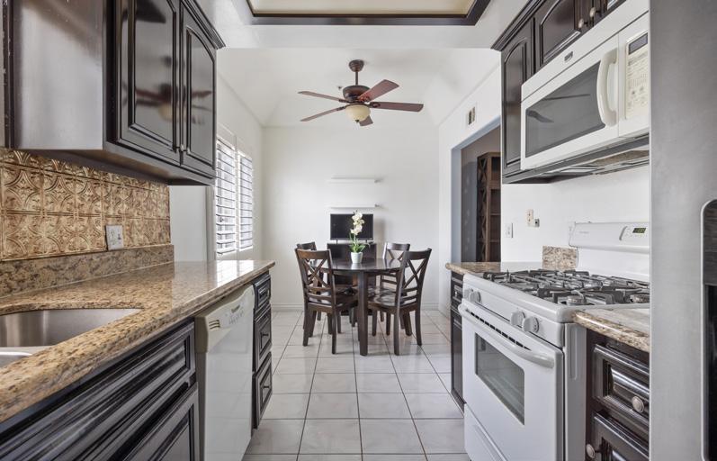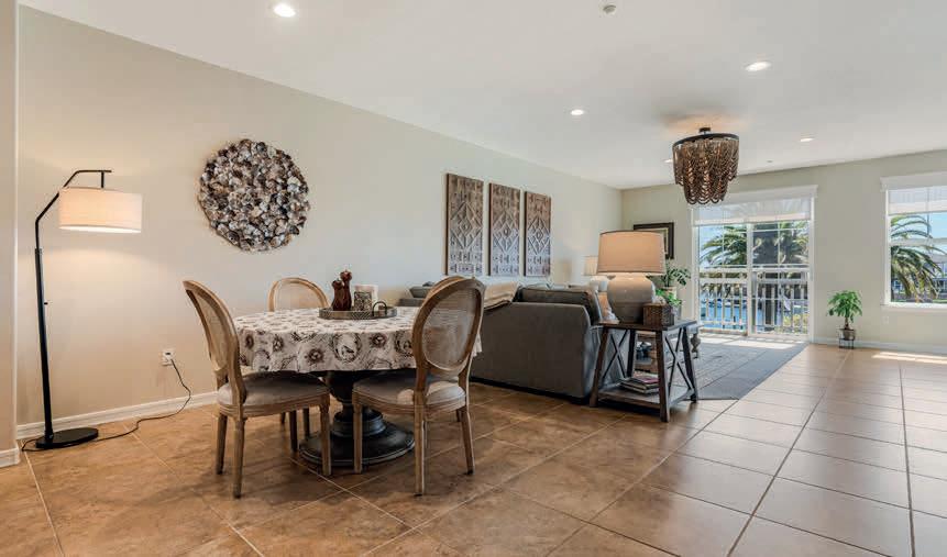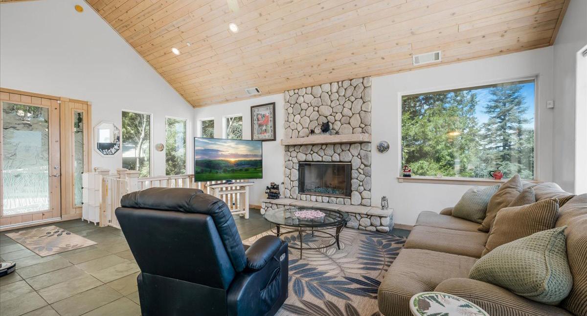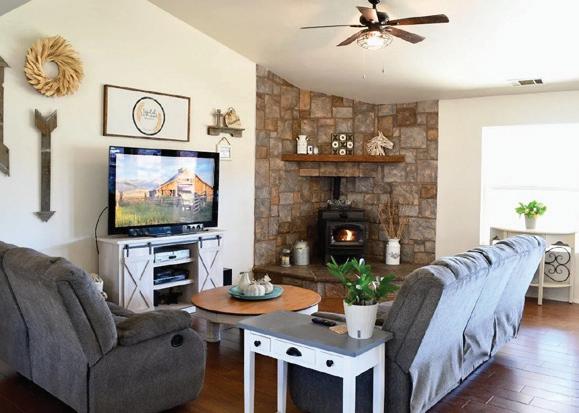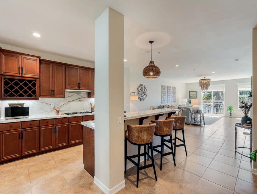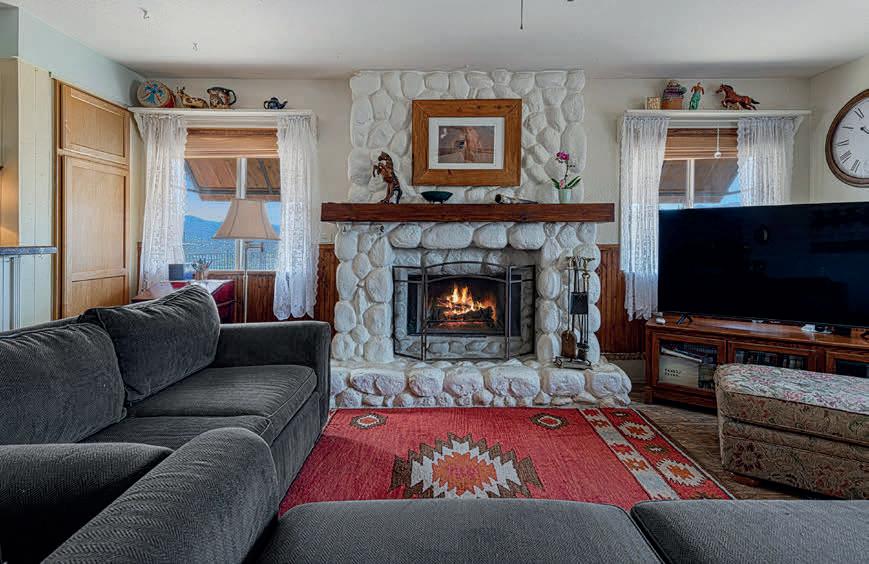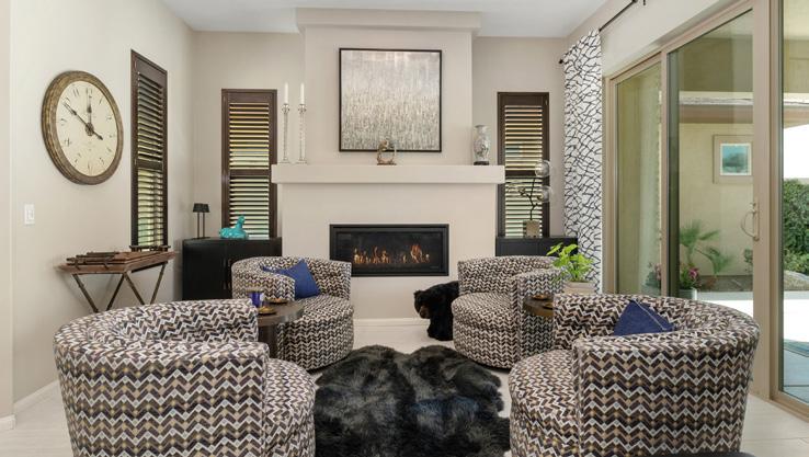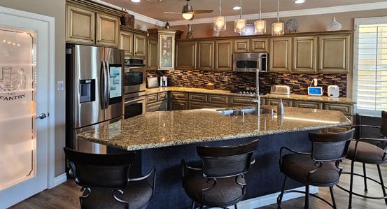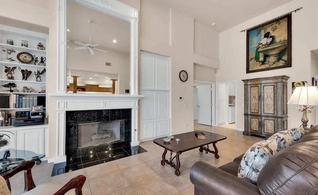 A private master suite provides a peaceful retreat, making it an excellent fit for families or snowbirds. The gourmet kitchen features high-end appliances, slab granite countertops, and custom banquette seating in the breakfast nook. The openconcept design flows effortlessly into the living area, complete with a cozy fireplace and custom built-in entertainment center— perfect for relaxing or entertaining.