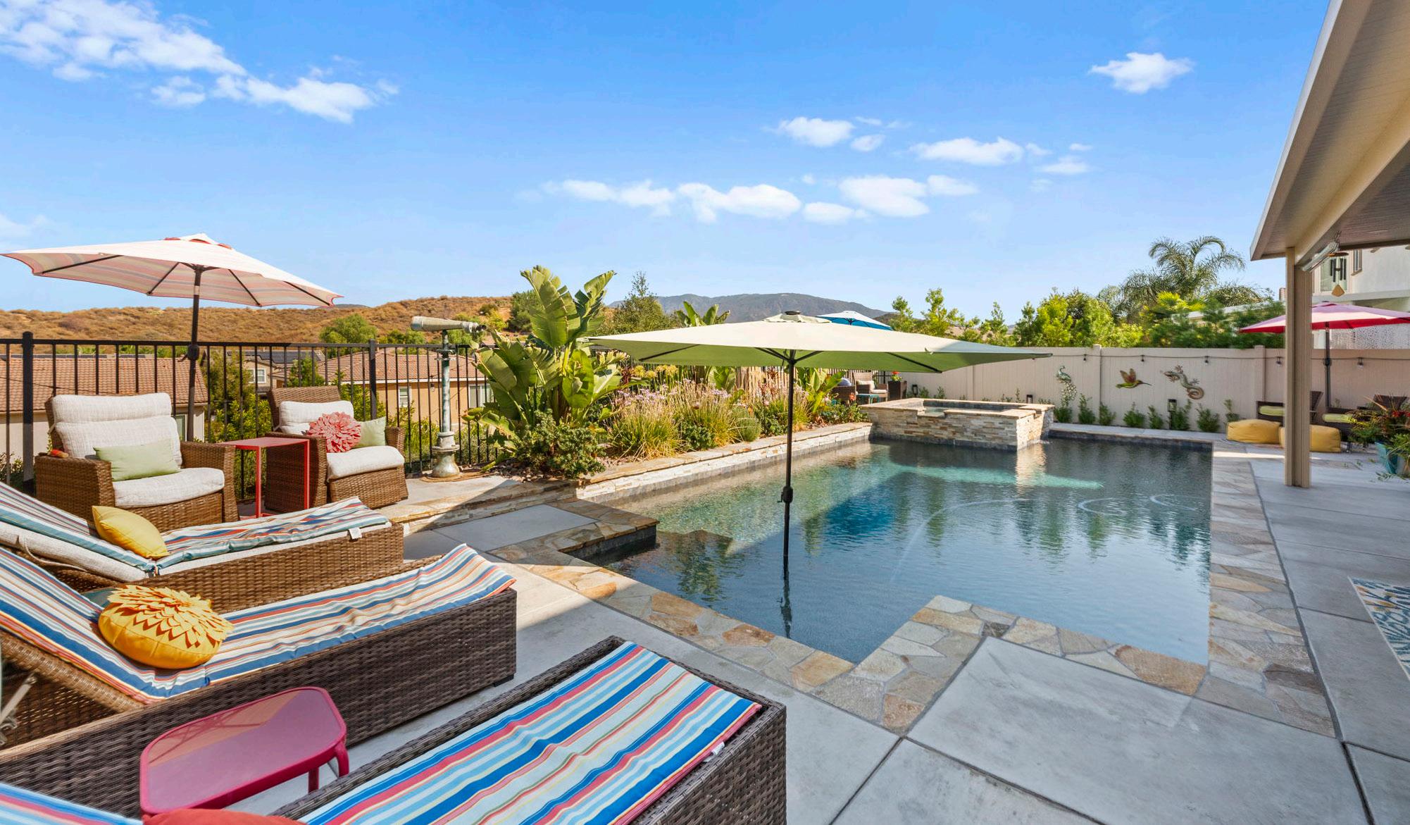 Natural light floods the home through expansive windows, highlighting the beautifully curated interior design. From everyday comfort to special occasions, every corner is crafted to elevate your lifestyle. Step outside to a tropical backyard oasis with a saline pool, spa, and mountain views. The large lot offers plenty of space to enjoy outdoor living at its finest.
