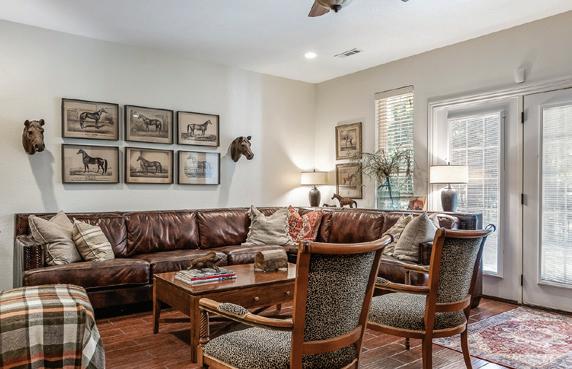 with brick fireplace, and elegant wood floors. Perfect for entertaining with a brick courtyard and covered patio. Modern kitchen includes double ovens and a dry bar. A luxurious retreat combining elegance, comfort, and outdoor living.