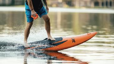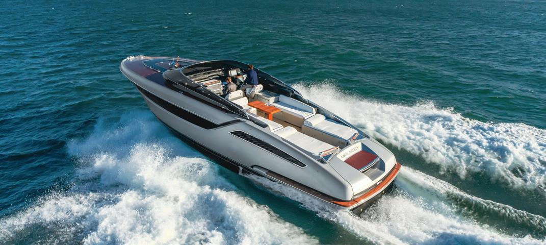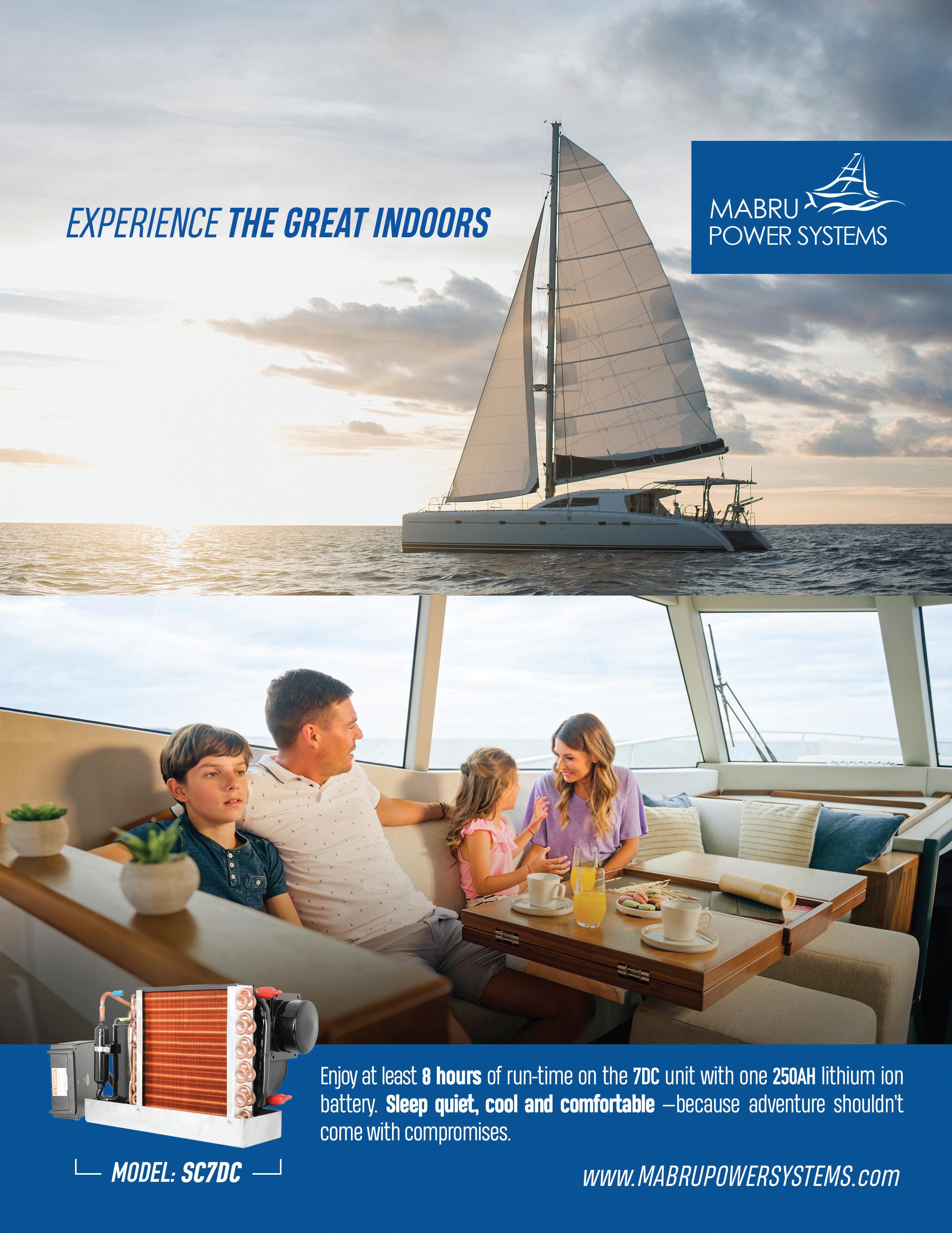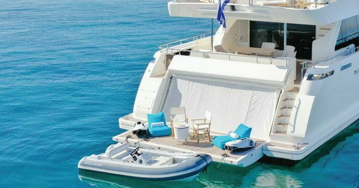 Additional highlights include a day head on the main deck, a fold-down garage door that creates a large swim platform, and a dedicated crew area with separate cabins and easy access to the engine room.