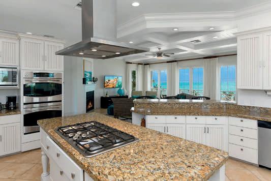 The heart of the home lies in its gourmet kitchen, equipped with stainless steel appliances, multiple sinks, and a large island and peninsula, offering abundant prep and dining space. The adjacent living room boasts unobstructed views of Emerald Bay, a cozy working fireplace, and ample seating for family gatherings. Step out onto the half-wraparound balcony or the pool deck to dine al fresco while enjoying the soothing sounds of the ocean and the gentle island breeze.