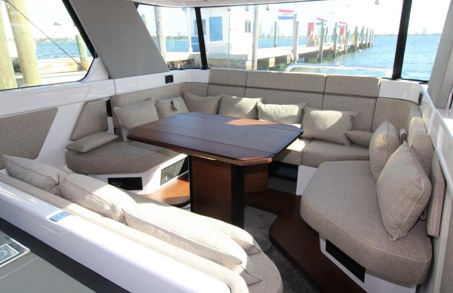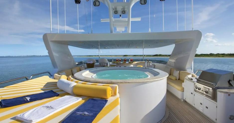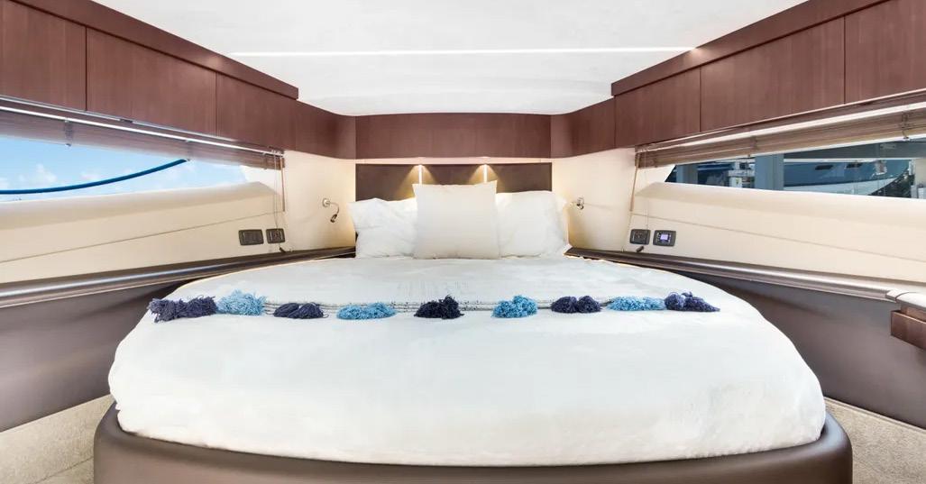 Additional highlights include a day head on the main deck, a fold-down garage door that creates a large swim platform, and a dedicated crew area with separate cabins and easy access to the engine room.