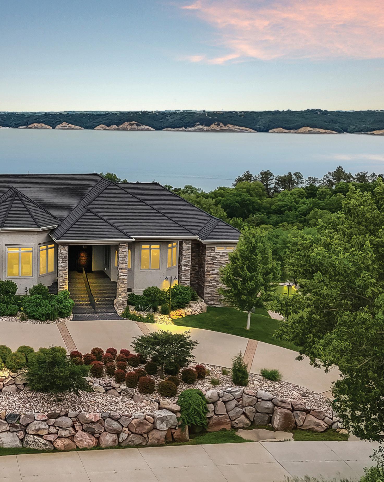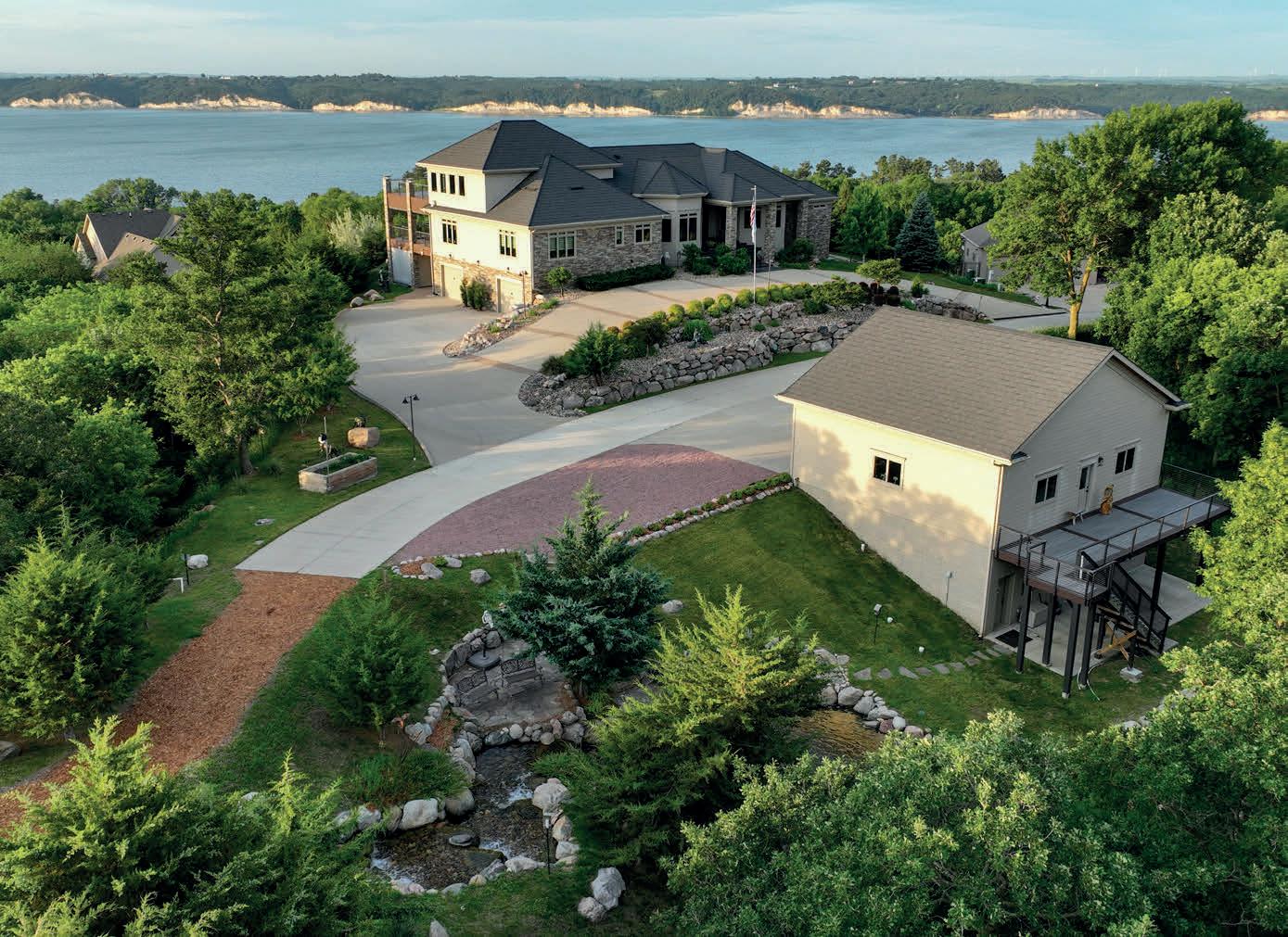 For those searching for the ultimate luxury lake retreat in one of the Midwest’s most highly rated small communities, this custom-built estate offers a rare opportunity. Situated on 5.5 private acres with panoramic views of Lewis & Clark Lake, and only minutes from Lewis & Clark Marina, this fully furnished home offers over 8,500 square feet of impeccably finished living space, combining timeless design with elevated modern amenities. A concrete circular drive, impeccable landscaping, and a striking EFIS-and-brick exterior set the tone, topped with a metal architectural roof that will last a lifetime. More than 2,800 sq. ft. of heated garage space includes a detached 3-stall garage—one with a 12-foot overhead door, perfect for RV or boat storage— and a heated and cooled walkout basement workshop with kitchenette sink, ideal for conversion into a guest suite or studio. Inside, nearly every room captures unobstructed lake views. Rich wood flooring runs predominantly throughout, as well as radiant heated floors in main floor bedrooms baths. The entire basement has heated floors for coziness. The gourmet kitchen is designed to impress with double islands, Thermador appliances, and a mixture of marble, quartz, and up-lit quartzite countertops—perfect for both everyday luxury and effortless entertaining. The home is tailored for comfort and function, featuring two full kitchens, two laundry rooms (including one in the primary suite), three family rooms, a dedicated wine room, and four gas fireplaces. Each of the four bedrooms includes its own en-suite bath, with the primary suite offering spa-level features including heated floors, private water closet with bidet, breakfast bar and custom built-ins. An elevator provides access to all levels, and the outdoor living spaces are just as extraordinary—with more than 2,500 sq. ft. of covered lake-facing decks and patios. Hurricane screens, multiple fire pits, seating areas, and portable heaters allow for year-round enjoyment. The Signal Point landing with a fire pit, pergola, and impressive rock water feature is the perfect gathering place at the lake. If you want space, privacy, timeless design, and unforgettable views in a sought-after lakefront location, this estate delivers on every level—a true legacy property that redefines luxury living in the Midwest. www.kerrywoehl.com/signal-hill