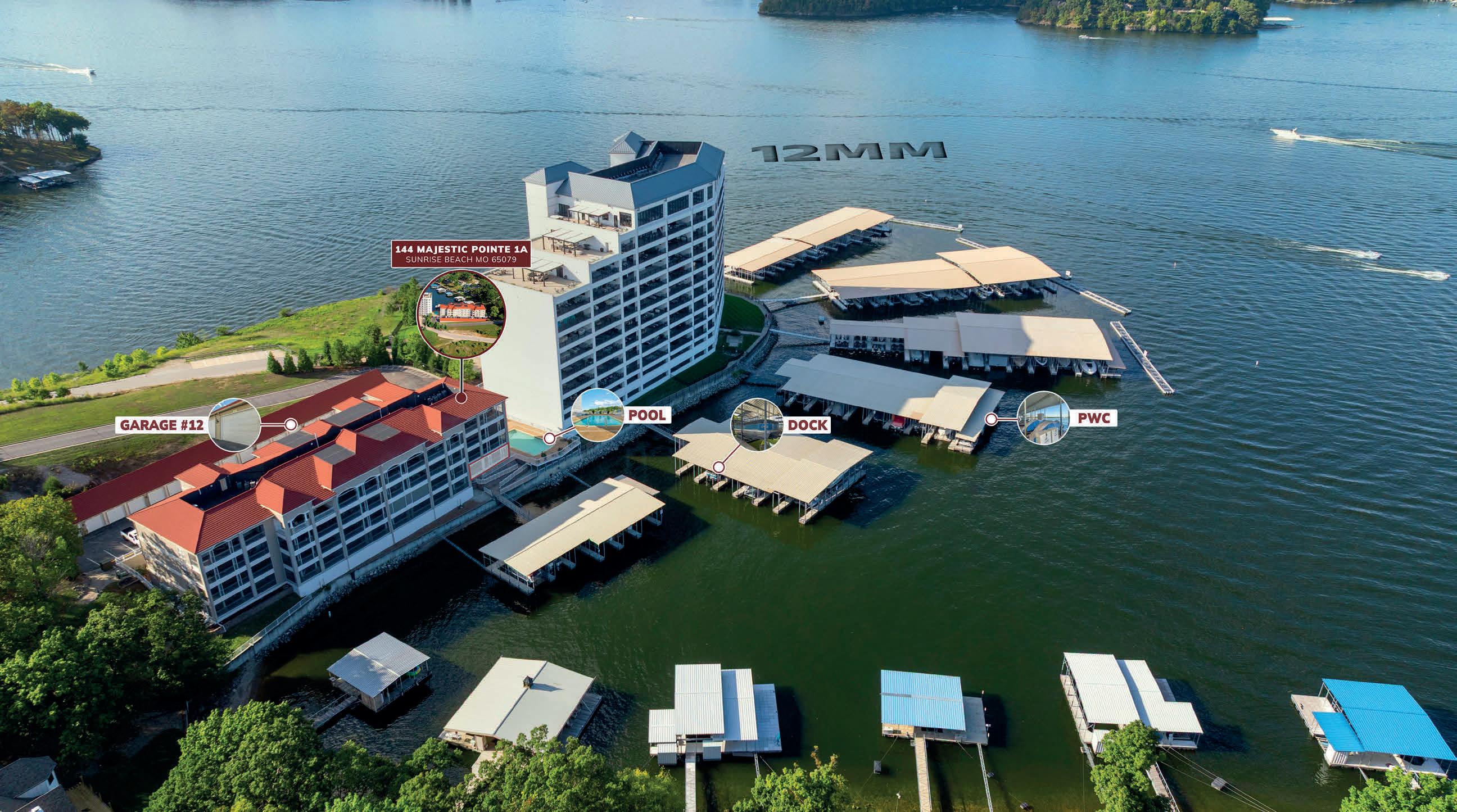 Majestic Pointe Condominiums present a rare offering—this is the only residence in the community with private walk-out access to the lakeside pool from its screened deck. Inside, expansive sliding glass doors create a seamless connection between the living area and the covered outdoor space. This 3-bedroom, 3-bath end unit features single-level living, an open and bright interior, a custom pantry with pull-out organization, and a spa-like primary suite with direct deck access. Elevator convenience provides a true zero-step option, while gated entry and carefully maintained grounds establish a distinguished, low-maintenance lakeside setting. A 12x32 boat slip is included, offering effortless access and a fully realized lakeside lifestyle. Garage #12 is offered at $35,000, and two PWC slips with lifts are available for $15,000—an exceptional complement to lakeside living.