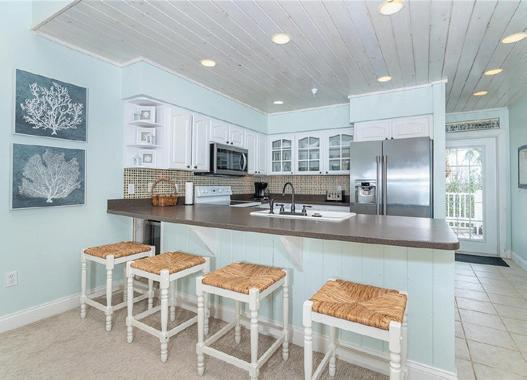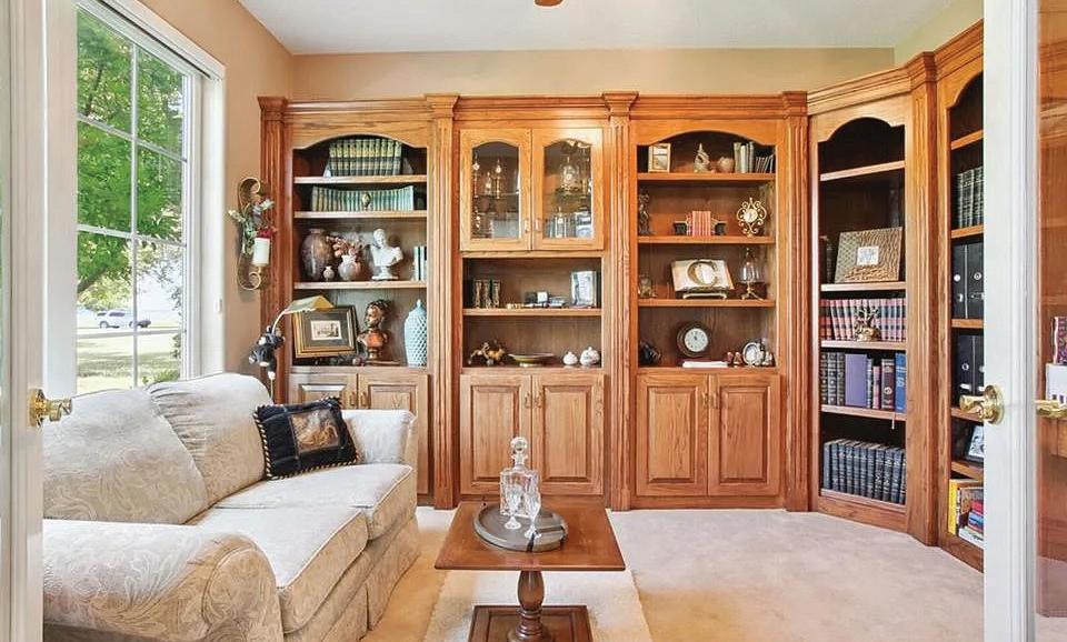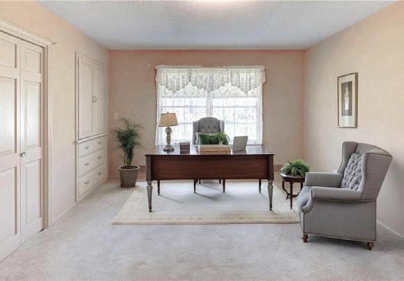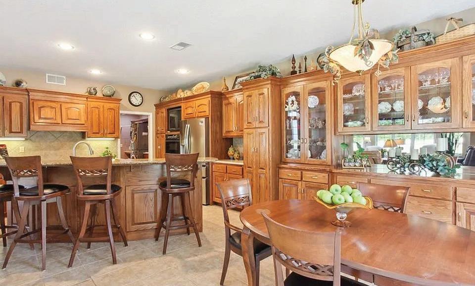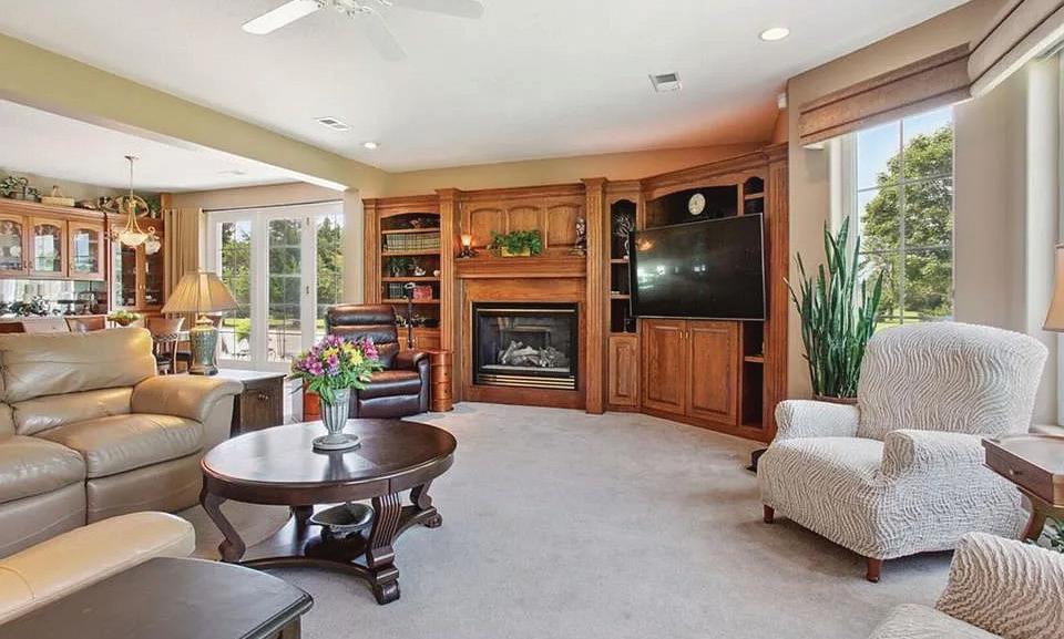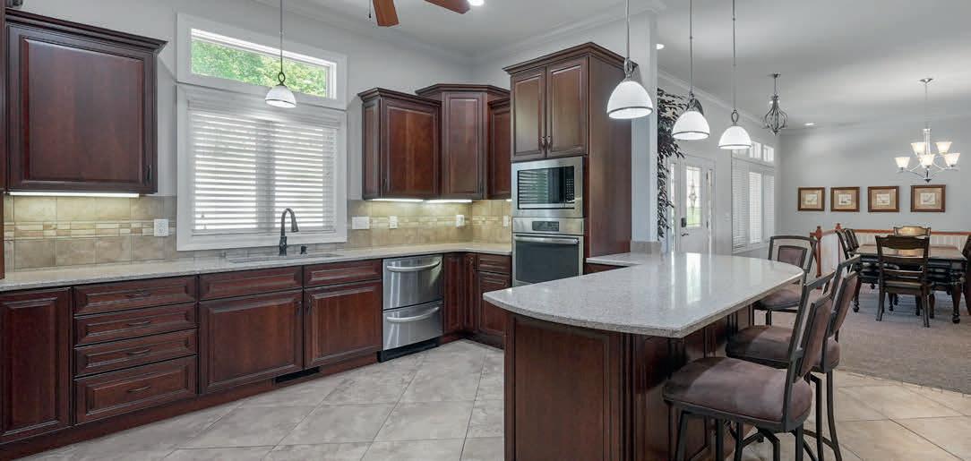 features Living/Dining rm, Family rm w/ Brick gas fireplace flanked by bookshelves, wet bar & patio door leading to your large patio w/ brick pony wall overlooking the Golf Course. The chef in the Family w/ Enjoy the Abundant Kitchen cabinets, w/ appliances, pantry,