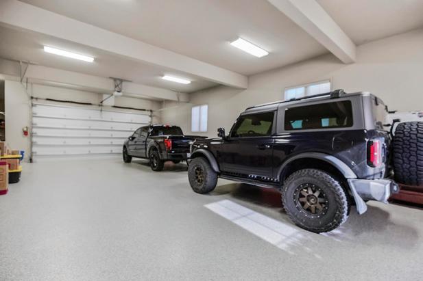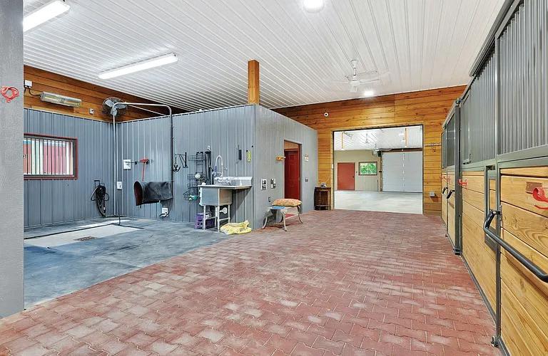 Not to be overlooked is the temperature controlled, over 2300 square foot 6 car dream garage with epoxy coated floors, high ceilings, and an air compressor that can stay. The larger side of the garage, measuring 30’x50’, features a 10’ garage door and has more than enough space to store multiple cars as well as a large boat.