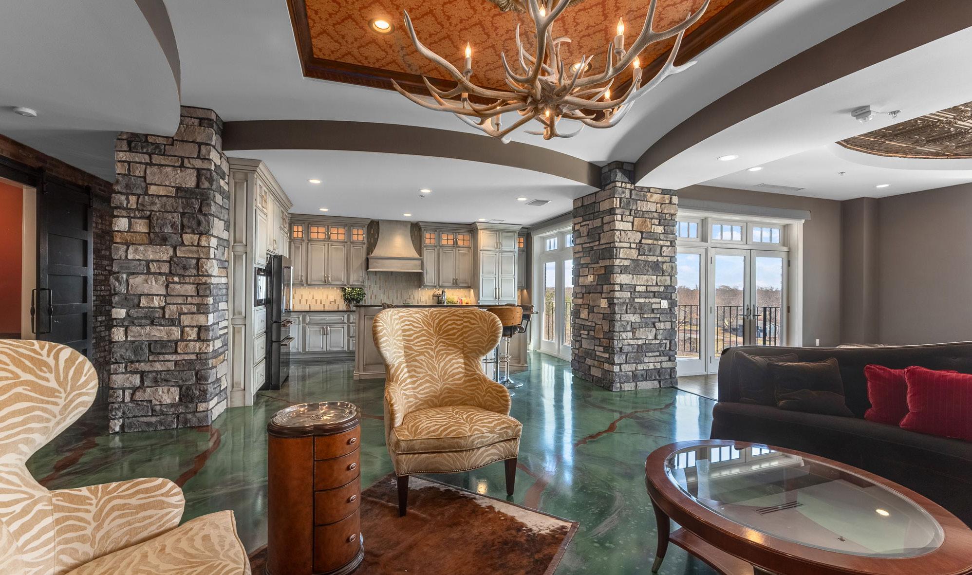 What isn’t custom in this immaculate 5th story condo? Owner has spared no expense with irreplaceable touches to seemingly every inch of this one of a kind condo boasting amazing views of the city through the expansive floor to ceiling windows. Hard to miss the artisan epoxy floors, and one of a kind elk antler chandelier as you enter. In the living area you’ll find a custom fire place with hand crafted iron accents, this room flows out to the covered balcony. Moving to the kitchen you’ll find a hidden walk-in pantry, one of a kind granite countertops, induction cook top, double oven, under & in cabinet lighting. Down the hallway there are large barn doors for room number 1, tray ceilings throughout and designer stonework accents. Within the main suite is a expansive walk-in closet and beautiful city views. Also within the master suite is a private bathroom, pristine floor to ceiling tiled walk in shower, whirlpool tub, and a dual vanity with hammered copper sinks. The exceptional, made to order furniture collection is negotiable. Truly a one of a kind condo. Icluded ammentites are a 24/7 fitness center, club room, guest suite, underground parking and more.