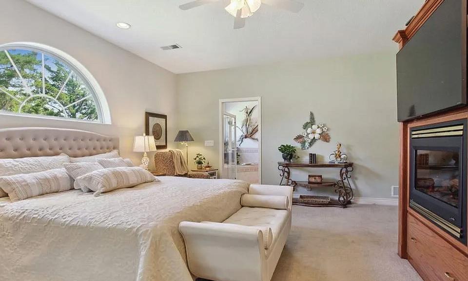 It features a stunning spacious, lush, wooded, oversized lot that backs to acres of open green space. Tucked back into a cul-de-sac, the walking trail, firepit, and beautiful large trees create your own private oasis. Perfect for a pool!