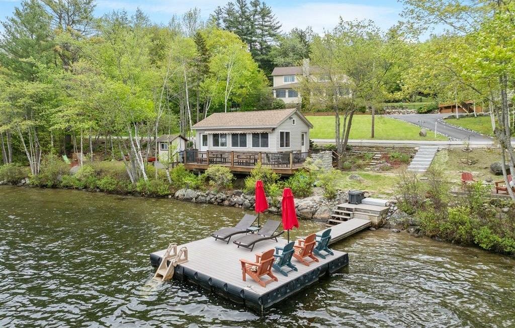 Located in highly desirable Meredith, does not come to market often. Well, that time has come! This stunning waterfront home includes 2.2 acres of meticulous landscaping, featuring lush plantings and a man-made lined frog pond with dry stream, all leading to 163 ft of private perched beach and a classic Boathouse with an exceptional docking system. The beautifully finished Boathouse features 4 boats lifts, 2 jet ski minis with walkway, an 8,000-pound lift in the boathouse, as well as a 10,000-pound lift at the guest slip. The Boathouse docking system has been replaced and upgraded with the matching exterior color scheme that is throughout the property. Breathtaking Southwest views offer unmatched sunsets across Meredith Bay. Step inside this 5,700+ square foot, 13-room Adirondack home, featuring soaring ceilings, beautiful flooring, and 5 bedrooms with 3 en-suites. There is a total of 5 bathrooms, 4 of which have been completely exquisitely remodeled in the last 120 days. The large living room, with its working fireplace, offers expansive lake views. Step out onto the 3-season heated porch to enjoy summer nights and dinner with friends and family. End the night on your private deck with a fire pit off the large primary bedroom. The expansive finished lower level provides walkout to the outside deck area and walkways to the beach. This level includes another huge working fireplace, bar area and game room.