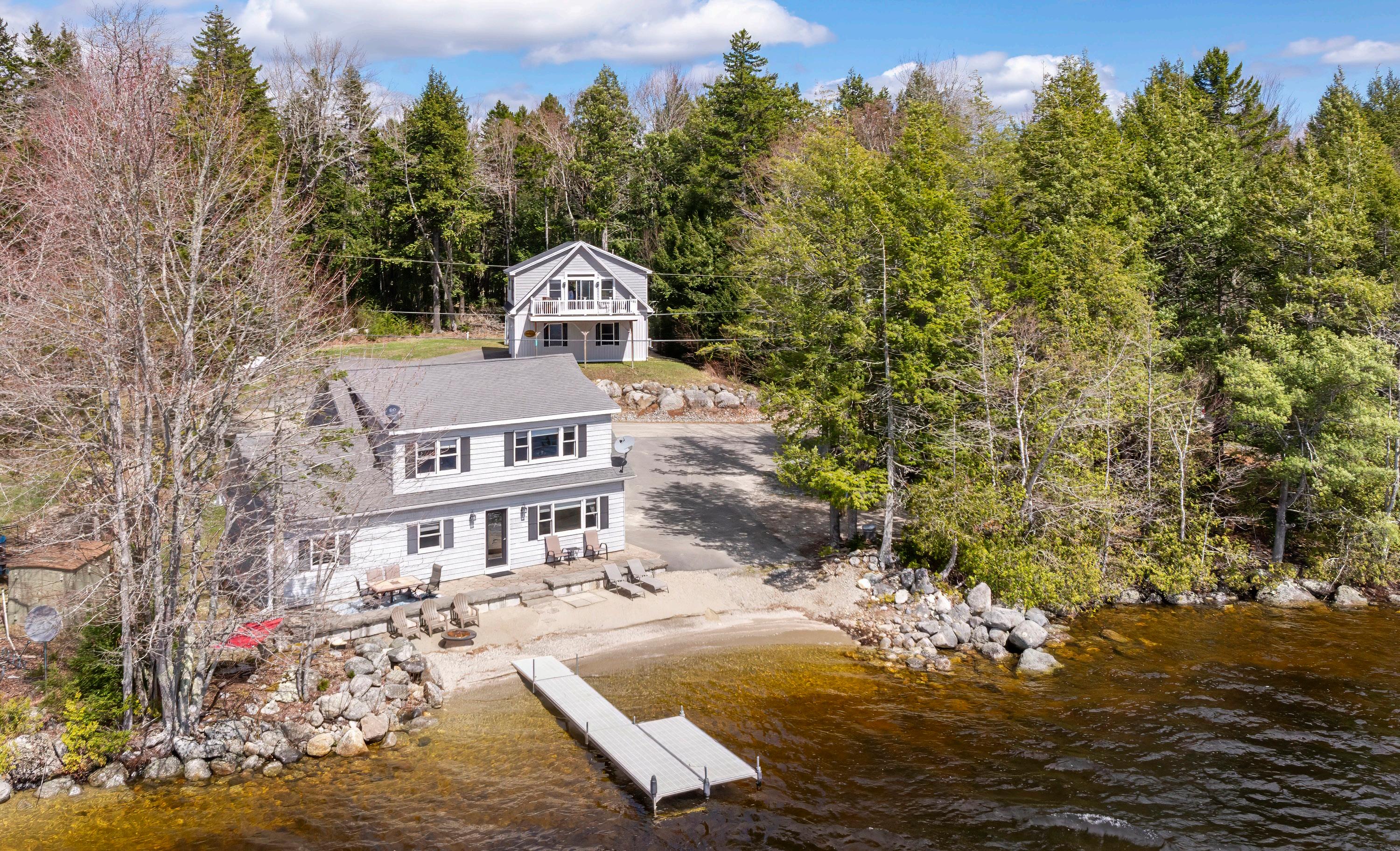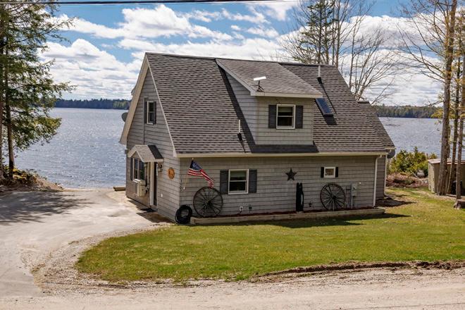 Welcome to Molasses Pond, a 1280-acre pond with an island. Waters Edge is a 4 BR / 2 BA custom-built and well-maintained home within 50 feet of the Pond with its own private, sandy beach. Enjoy the beautiful sunsets and watch the eagles as you relax in this fully furnished home which is great for entertaining or generating income as a rental. The oversized primary bedroom overlooks the pond so you can lay in bed and look out over the water, falling asleep to the sound of the waves lapping at the shore or the loons serenading. Granite countertops grace the kitchen and bathrooms; pine walls and custom trim are accented by rustic farmhouse decor and antiques. Builder spared no expense on the finishing of this gorgeous gem but what sets it apart is the close proximity to the water and the sandy beach! Included is a 2-car garage and studio apartment—the Overlook—which has a 5-star rental rating and established rental history, Named the Overlook because of the beautiful view through the sliding doors leading onto a second story deck. New automatic generators and heat pumps installed for both the house and studio apartment/garage and new boiler for the house. The properties are turnkey and ready for renting or enjoying. This property is a must-see!
