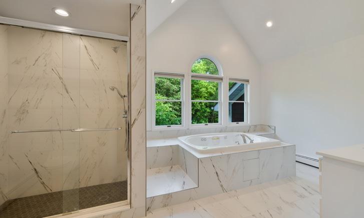 high paneled wood ceilings and doors to a deck overlooking the tennis court. The second floor offers three bedrooms, including a primary suite with a unique bathroom within the home’s turret. The finished lower level boasts exposed stone foundations, a rec room with a fireplace and bar, and potential wine room. Located less than an hour from NYC and minutes from downtown Stamford, this home truly provides an idyllic country escape with city conveniences.