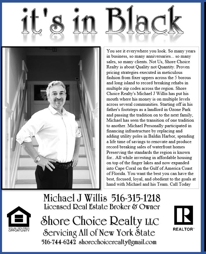 You see it everywhere you look. So many years in business, so many anniversaries... so many sales, so many clients. Not Us, Shore Choice Realty is about Quality not Quantity. Proven pricing strategies executed in meticulous fashion from fixer uppers across the 5 boroughs and long island to record breaking rehabs in multiple zip codes across the region. Shore Choice Realty’s Michael J Willis has put his mouth where his money is on multiple levels across several communities. Starting off in his father’s footsteps as a landlord in Ozone Park and passing the tradition on to the next family, Michael has seen the transition of one tradition to another. Michael Personally participated in financing infrastructure by replacing and adding utility poles in Baldin Harbor, spending a life time of savings to renovate and produce record breaking sales of waterfront homes Preserving the standards the region is known for.. All while investing in affordable housing on top of the finger lakes and now expanded into Cape Coral on the Gulf of America Coast of Florida. You want the best you can have the best, focused, loyal, and obedient to the goals at hand with Michael and his Team. Call Today