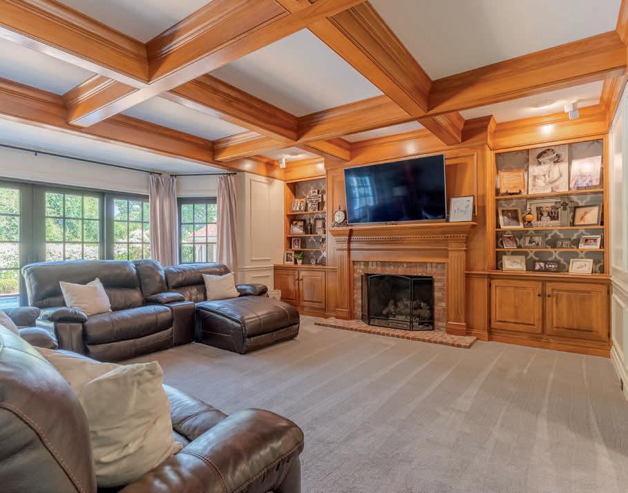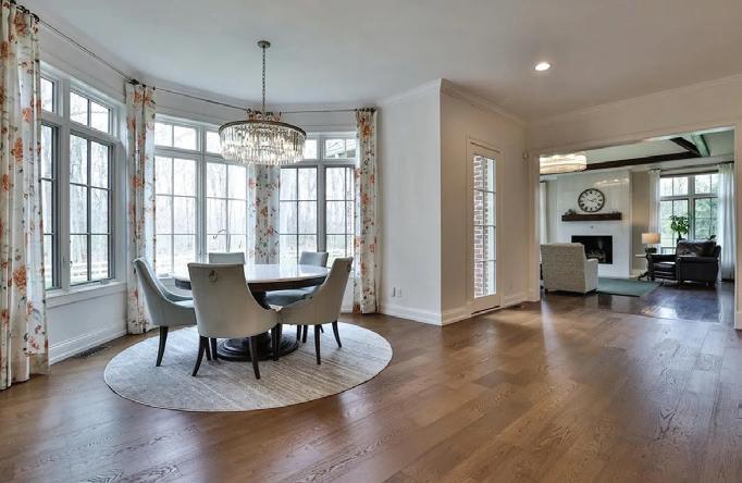 A sweeping circular drive and pillared front porch introduce the home’s refined presence. Inside, hardwood floors extend throughout both levels, connecting gracious entertaining spaces—the formal dining room, a large living room with custom Venetian plaster fireplace, a paneled den-study, and a main-level guest suite with private en-suite.