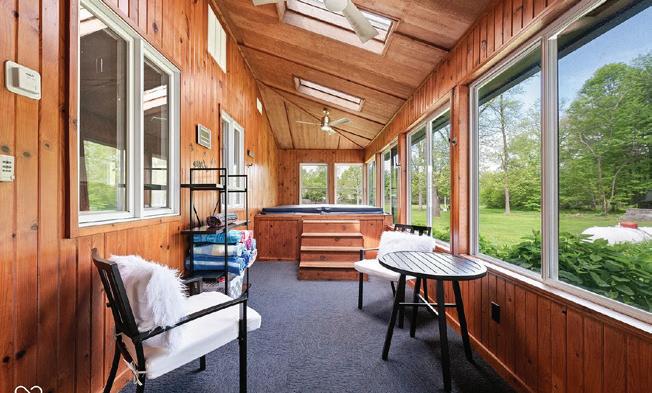 This serene 6-acre oasis north of IU Stadium offers privacy, mature trees, and a tranquil setting. Features include a renovated barn with a changing area and half bath, an upper-level flex space, and wooded trails near Griffy Lake. Inside, expansive rooms with high ceilings, fireplaces, and ceramic tile create warmth and elegance. The gourmet kitchen boasts custom cabinetry, premium appliances, a walk-in pantry, and a large island. The home includes spacious dining and living areas, a library with custom shelves, a luxurious primary suite with pool access, plus two en-suite bedrooms, a laundry room, and a half bath.