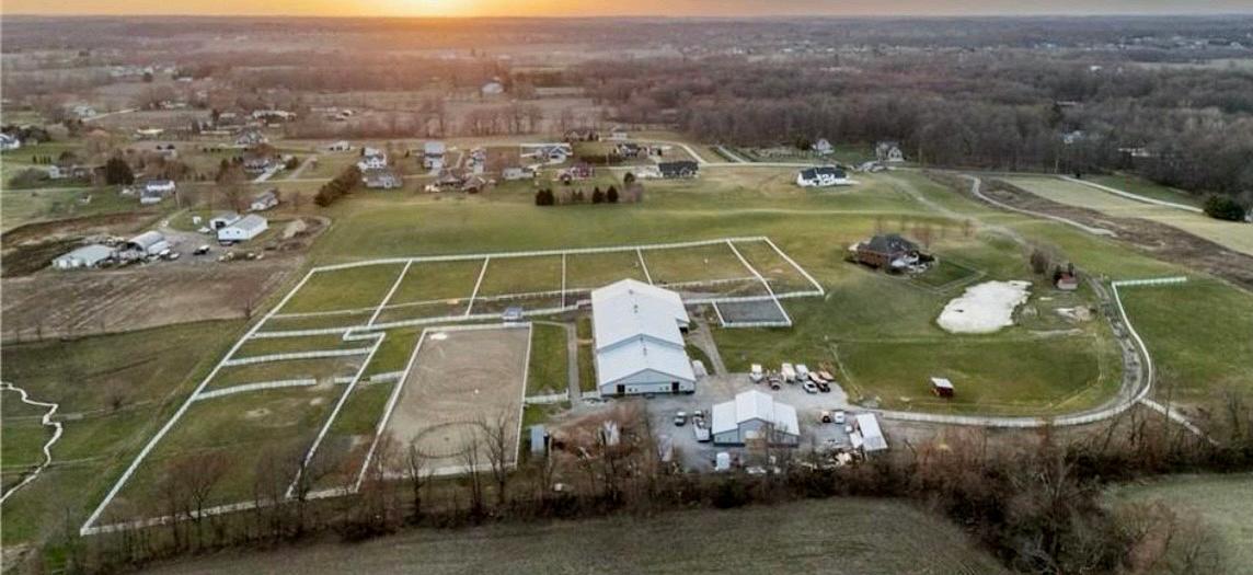 Situated on 27+ manicured acres, this home offers exceptional quality craftsmanship at every turn. The spacious main-level primary suite includes a large en-suite bathroom with laundry and a 12’ x 12’ closet space. The property is an absolute dream for equestrian enthusiasts, featuring two separate barns with internal access to a heated 140’ x 70’ indoor arena. A 17-stall horse barn and a 10-stall “owner’s barn” both include tack/viewing rooms and the larger barn contains a bathroom. The owner’s barn also offers 12’x10’, 12’x12’, and 12’x14’ stalls with a covered run-out area, along with a heated feed room and therapy ramp. The four dry lots are a hard-to-find feature and add incredible versatility to the grounds. The property also includes a double wash area with hot/cold water and a single wash area with hot/cold water access and a spacious 16’ wide aisle with room for additional hay lofts. Both the main home and barn are equipped with natural gas generators. Brand new shop with equipment storage, garage and 1-bedroom apartment. The massive 315’ x 100’ outdoor arena features a covered judge’s booth/viewing area, along with eight additional pasture run-in stalls. This property is a turn-key horse farm with caretakers in place through end of 2025.
