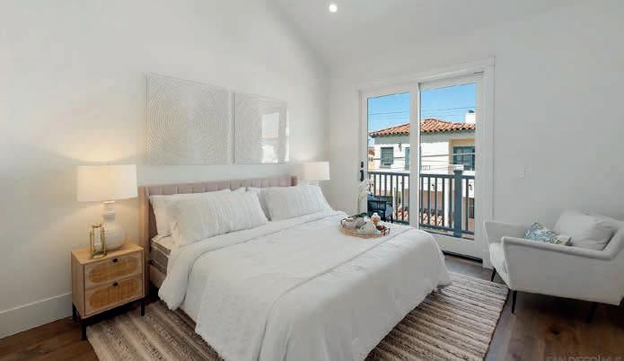 Beautifully remodeled from top to bottom in 2024, this property is stunning with all new flooring, counter tops, appliances, new AC & heat, window coverings and interior wall removal so the kitchen is open towards the living, dining and family room! As you walk in to this property, you instantly notice the amount of natural light coming from all angles. The double height living room further invites you to enjoy this home indoors or flow to the outside through its sliding glass vinyl doors and take advantage of the large wrap around patio with both natural lawn and concreted areas. There is 1 full bedroom and full bath on the first level. The stairs lead you up to two very large bedrooms, the West facing main bedroom has a balcony that boasts beautiful views towards the Pacific Ocean and Point Loma in the distance. The main bathroom was reconfigured to be much more useful than the original floor plan with the tub being removed and large shower added. Again, natural light and high ceilings in the main bedroom make the space serene and welcoming. The second bedroom has a great size to it along with a balcony that offers a great space for reading outdoors. The perfect home in an outstanding location, offering a beautiful balance between space and light.